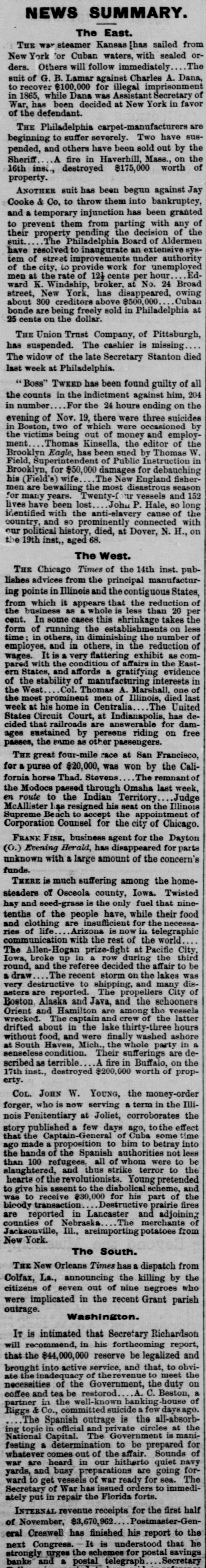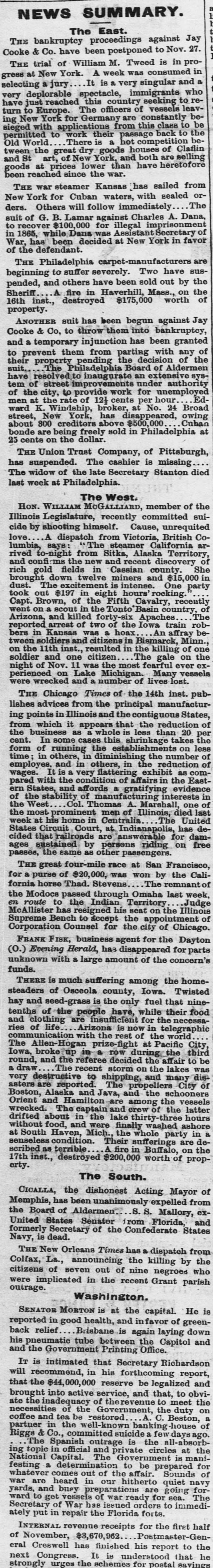 NEWS SUMMARY. The East. THE bankruptcy proceedings against Jay Cooke & Co. have been postponed to Nov. 27. THE trial of William M. Tweed is in progress at New York. A week was consumed in selecting a jury It is very singular and a very deplorable spectacle, immigrants who have just reached this country seeking to return to Europe. The officers of vessels leaving New York for Germany are constantly besieged with applications from this class to be permitted to work their passage back to the Old World There is a hot competition between the great dry goods houses of Claflin and St art, of New York, and both are selling goods at prices lower than have heretofore been reached since the war. THE war steamer Kansas has sailed from New York for Cuban waters, with sealed orThe ders. Others will follow immediately suit of G. B. Lamar against Charles A. Dana, to $100,000 for illegal aprisonment in 1865, while Dana was Assistant Secretary of War. has been decided at New York in favor of the defendant. THE Philadelphia carpet-manuf acturers are beginning to suffer severely. Two have suspended, and others have been sold out by the Sheriff A fire in Haverhill, Mass., on the 16th inst., destroyed $175,000 worth of property. ANOTHER suit has been begun against Jay Cooke & Co, to throw them into bankruptcy, and temporary injunction has been granted to prevent them from parting with any of their property pending the decisio of the suit. ..The Philadelphia Board of Alder have resolved to inaugurate an exte ensive system of street provements under authority of the city, to provide work for unemployed men at the rate of 12} cents per hour Edward K Windship, broker, at No. 24 Broad street New York, has disappeared, owing about 300 creditors above $500,000 Cuban bonde are being freely sold in Philadelphia at 25 cents on the dollar. THE Union Trust Company, of Pittsburgh, has suspended. The cashier is missing The widow of the late Secretary Stanton died last week at Philadelphia. The West. HON. WILLIAM GALLIARD, member of the Illinois Legislature, recently committed suicide by shooting himself. Cause, unrequited love. A dispatch from Victoria, British Columbia says: The steamer California arrived to-night from Sitka, Alaska Territory, of and confirms the new and recent discovery rich gold fields in Cassian county. She brought down twelve miners and $15,000 in dust. The is intense. One party took out $197 in eight hours' rocking Capt. Brown, of the Fifth Cavalry, recently went on scout in the Tonto Basin country, of Arizona, and killed fortv-six Apaches. The reported arrest of two of the Iowa train robbers in Kansas was a hoax An affray between soldiers and citizens in Bismarck, Minn. on the 11th inst. resulted in the killing of one soldier and one citizen The gale on the night of Nov 11 was the most fearful ever experienced on Lake Michigan. Many vessels were wrecked and a number of lives lost. THE Chicago Times of the 14th inst. publishes advices from the principal manufacturing points in Illinois and the contiguous States, from which it appears that the reduction of the business as whole is less than 20 per cent. In some cases this shrinkage takes the form of running the establishments on less time in others, in diminishing the number of employes. and in others, in the reduction of wages. It is a very flattering exhibit as compared with the condition of affairs in the Eastern States. and affords a gratifying evidence of the stability of manuf acturing interests in the West Col. Thomas A. Marshall, one of the most prominent men of Illinois, died last week at his home in Centralia The United States Circuit Court at Indianapolis, has decided that railroads are answerable for damages sustained by persons riding on free passes, the same as other passengers. THE great four-mile race at San Francisco, for a purse of $20,000, was won by the California horse Thad. Stevens The remnantof the Modocs passed through Omaha last week, en route to the Indian Territory Judge McAllister has resigned his seat on the Illinois Supreme Bench to accept the appointment of Corporation Counsel for the city of Chicago. FRANK FISK, business agent for the Dayton (0.) Evening Herald, has disappeared for parts unknown with a large amount of the concern's funds. THERE is much suffering among the homesteaders of Osceola county, Iowa. Twisted hay and seed-grass is the only fuel that ninetenths of the people have, while their food and clothing are insufficient for the necessaries of life Arizona is now in telegraphic aunication with the rest of the world The Allen-Hogan prize-fight at Pacific City Iowa, broke up in row during the third round, and the referee decided the affair to be a draw The recent storm on the lakes was very destructive to shipping, and many disasters are reported The propellers City of Boston, Alaska and Java, and the schooners Orient and Hamilton are among the vessels wrecked. The captain and crew of the latter drifted about in the lake thirty-thre hours without food. and were finally washed ashore at South Haven, Mich. the whole party in a senseless condition. Their sufferings are described as terrible A fire in Buffalo on the 17th inst., destroyed $200,000 worth of property. The South. CICALLA, the dishonest Acting Mayor of Memphis, has been unanimously expelled from the Board of Aldermen. S. S. Mallory, exUnited States Senator from Florida, and formerly Secretary of the Confederate States Navy, is dead. THE New Orleans Times has a dispatch from Colfax, La., announcing the killing by the citizens of seven out of nine negroes who were implicated in the recent Grant parish outrage. Washington. SENATOR MORTON is at the capital. He is reported in good health, and favor of greenback relief Brisbane is again laying down his pneumatic tube between the Capitol and and the Government Printing Office. IT is intimated that Secretary Richardson will recommend, in his forthcoming report, that the $44,000,000 reserve be legalized and br