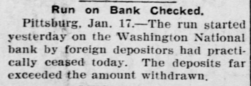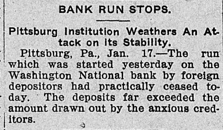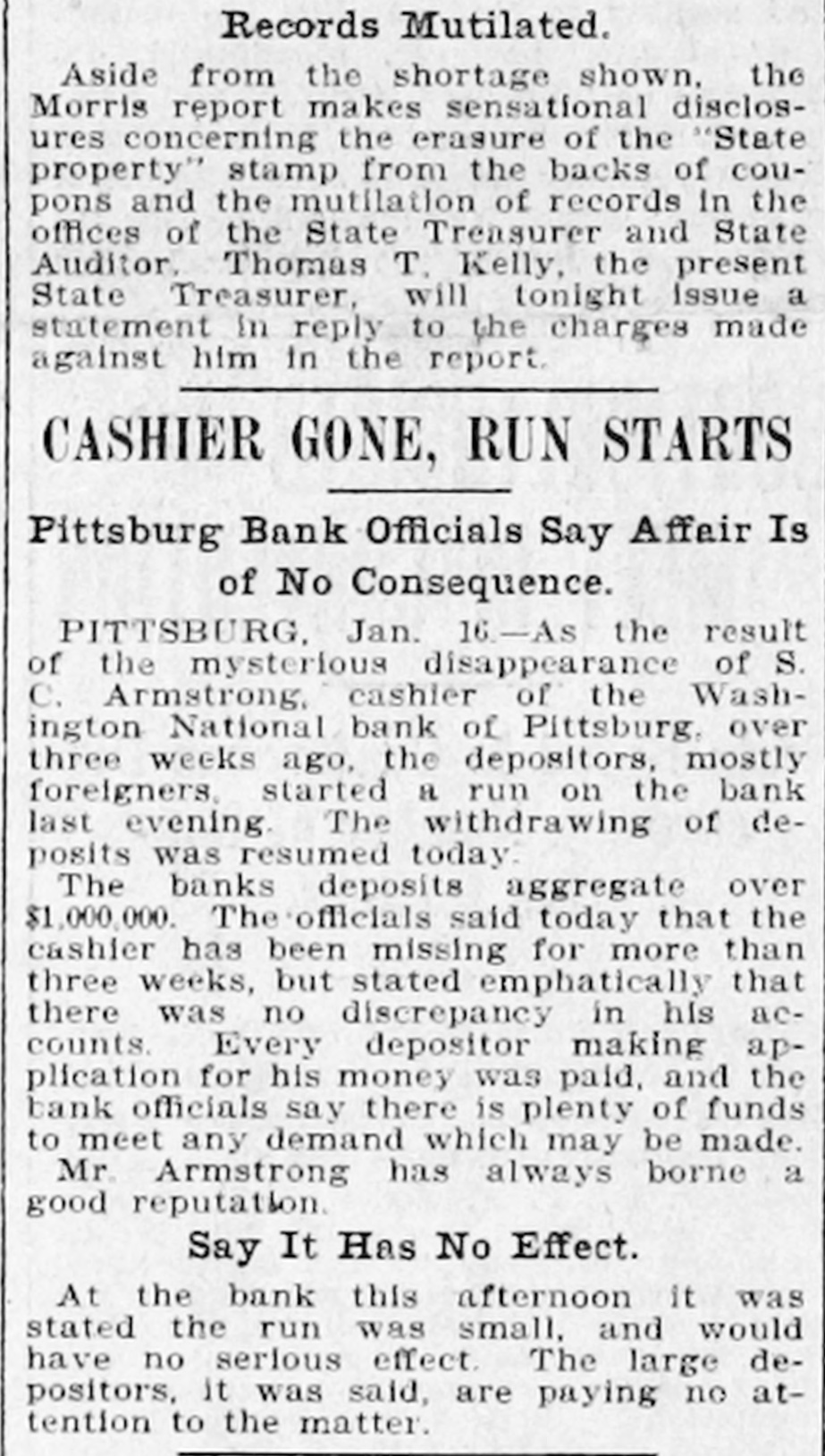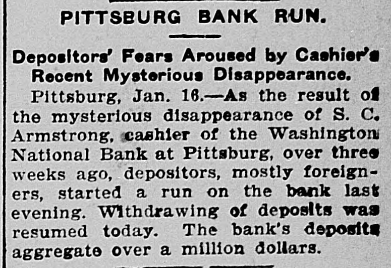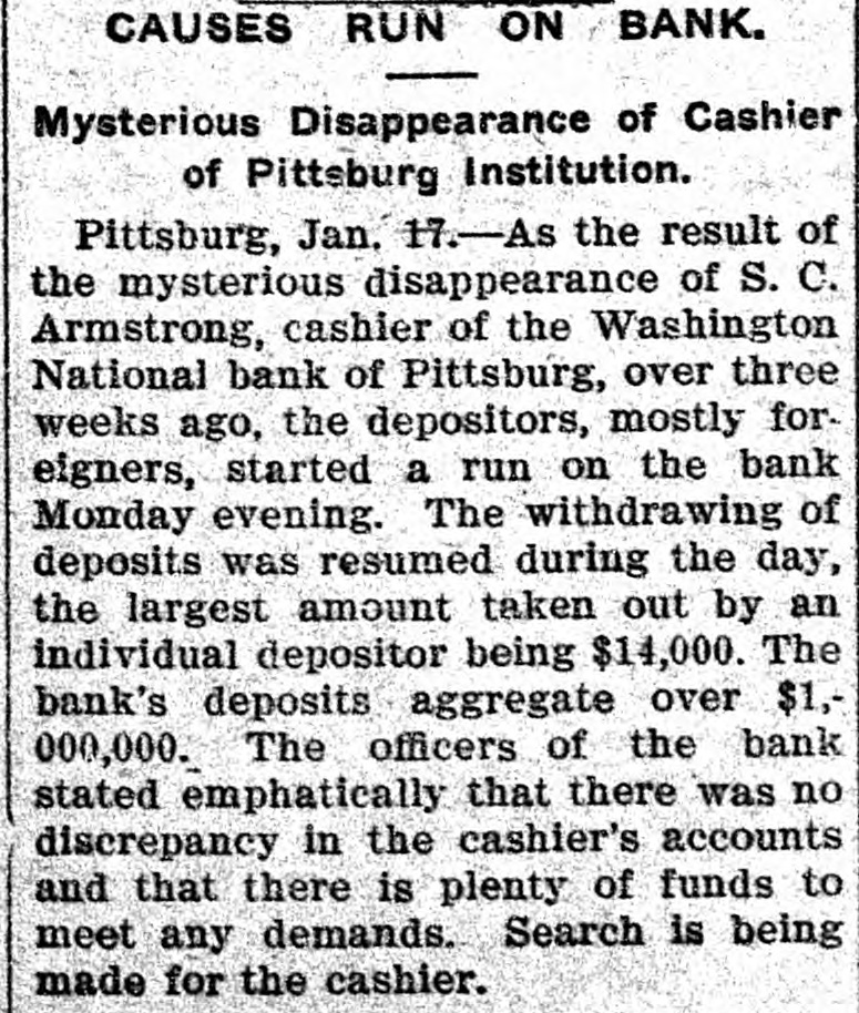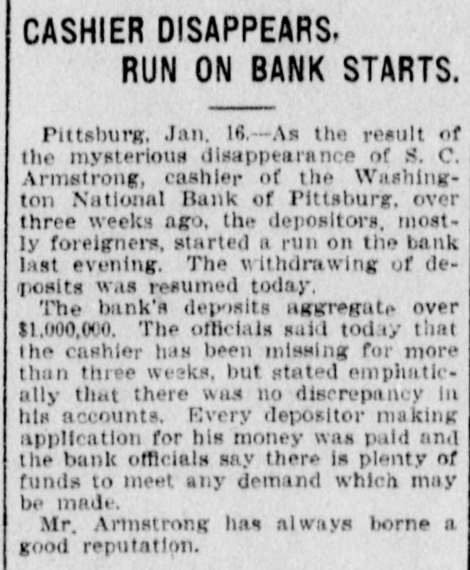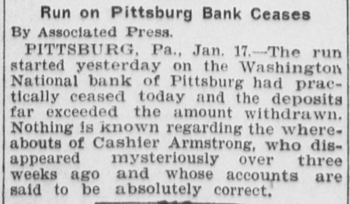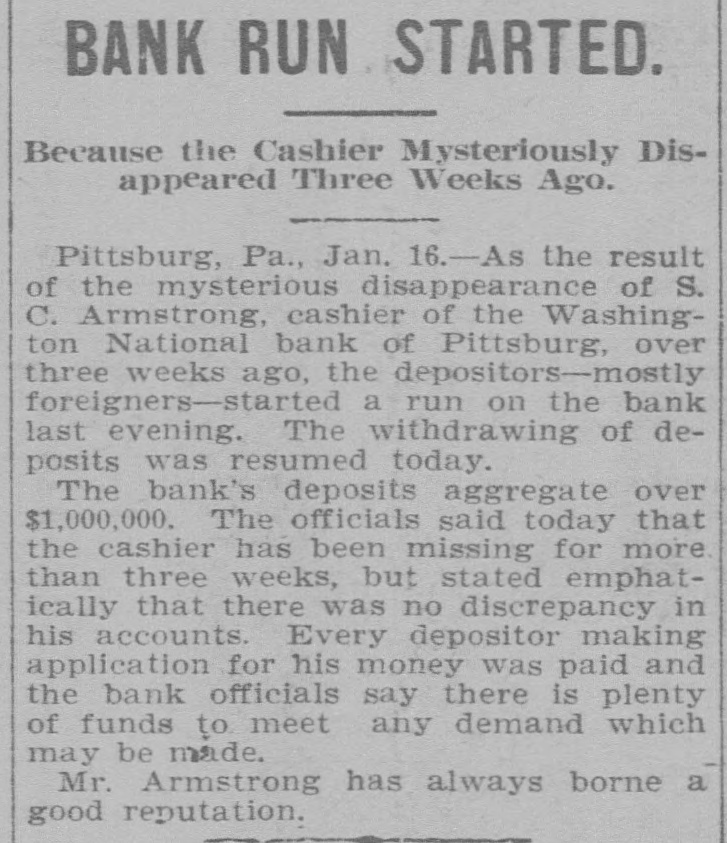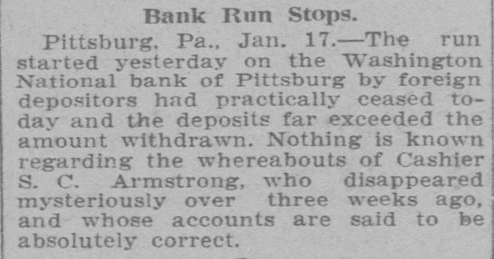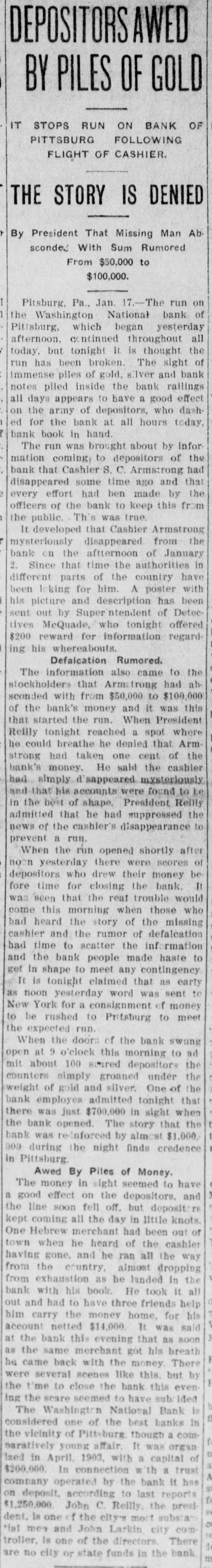 DEPOSITORS AWED BY PILES OF GOLD IT STOPS RUN ON BANK OF PITTSBURG FOLLOWING FLIGHT OF CASHIER. THE STORY IS DENIED By President That Missing Man Ab. sconded With Sum Rumored From $50,000 to $100,000. Pitsburg, Pa. Jan. -The run on the Washington National bank of Pittsburg, which began yesterday afternoon, continued throughout all today, but tonight it is thought the run has been broken. The sight of immense piles of gold, silver and bank notes piled inside the bank railings all days appears to have a good effect on the army of depositors, who dash. ed for the bank at all hours today, bank book in hand. The run was brought about by infor mation coming to depositors of the bank that Cashier S. C. Armstrong had disappeared some time ago and that every effort had ben made by the officers of the bank to keep this from the public. Th's was true. It developed that Cashier Armstrong mysteriously disappeared from the bank on the aftternoon of January 2. Since that time the authorities in different parts of the country have been loking for him. A poster with his picture and description has been sent out by Super intendent of Detectives McQuade, who tonight offered $200 reward for information regarding his whereabouts. Defalcation Rumored. The information also came to the stockholders that Armstrong had absconded with from $50,000 to $100,000 of the bank's money and it was this that started the run. When President Reilly tonight reached a spot where he could breathe he denied that Armstrong had taken one cent of the bank's money. He said the cashier had simply di sappeared mysteriously and that his accounts were found to be in the best of shape. President Reilly admitted that he had suppressed the news of the cashier's disappearance to prevent a run. When the run opened shortly after noon yesterday there were scores of depositors who drew their money be fore time for closing the bank. It was seen that the reaf trouble would come this morning when those who had heard the story of the missing cashier and the rumor of defalcation had time to scatter the inf rmation and the bank people made haste to get in shape to meet any contingency It is tonight claimed that as early as noon yesterday word was sent to New York for a consignment of money to be rushed to Pritsburg to meet the expected run. When the doors of the bank swung open at 9 o'clock this morning to ad mit about 100 scired depositors the counters simply groaned under the weight of gold and silver. One of the bank employes admitted tonight that there was just $700,000 in sight when the bank opened. The story that the bank was re-inforced by almost $1,000. 000 during the night finds credence in Pittsburg. Awed By Piles of Money. The money in sight seemed to have a good effect on the depositors, and the line soon fell off. but depositors kept coming all the day in little knots. One Hebrew merchant had been out of town when he heard of the cashier having gone, and he ran all the way from the country, almost dropping from exhaustion as he landed in the bank with his book. He took it all out and had to have three friends help him carry the money home. for his account netted $14,000. It was said at the bank this evening that as soon as the same merchant got his breath he came back with the money There were several scenes like this. but by the time to close the bank this even ing the scare seemed to have sub idea The Washington National Bank is considered one of the best banks in the vicinity of Pittsburg though a comnaratively young affair. It was organ ized in April, 1903. with a capital of $200,000. In connection with a trust company operated by the bank it has on deposit. according to last reports $1,250,000. John C. Reilly, the prestdent. is one of the city's most substan tial men and John Larkin city com troller, is one of the directors. There are no city or state funds in the bank