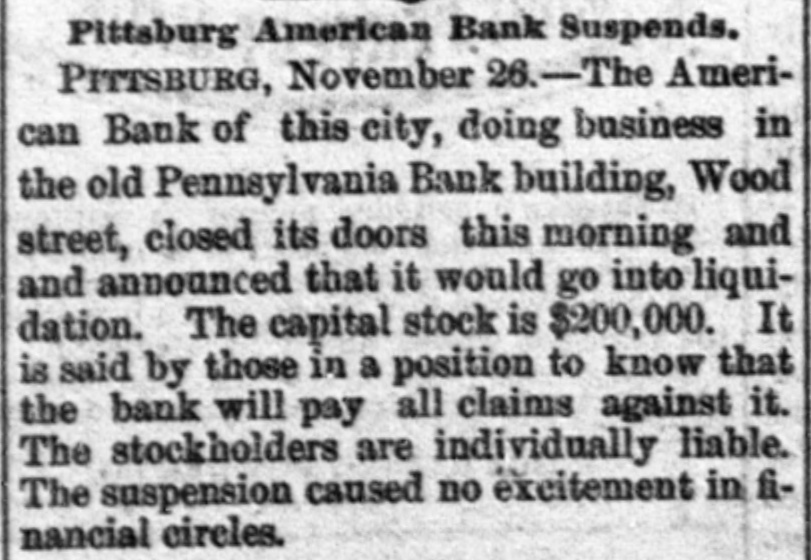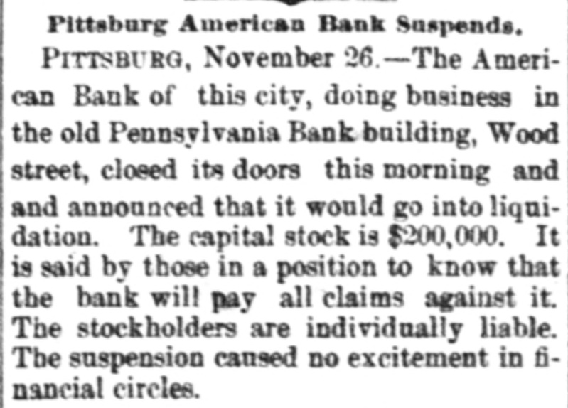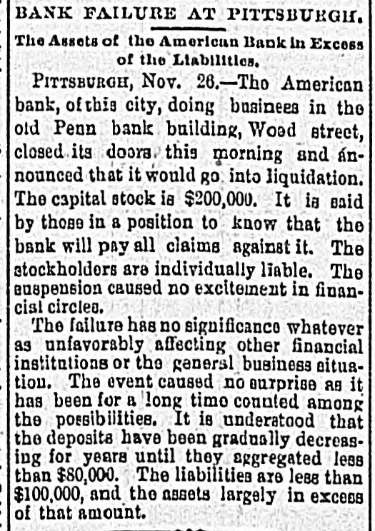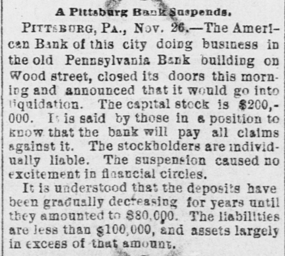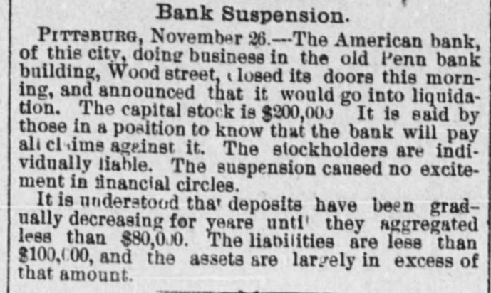 A Pittsburg Bank Suspends, PITTSBURG, PA., Nov. 26.-The American Bank of this city doing business in the old Pennsylvania Bank building on Wood street, closed its doors this morning and announced that it would go into liquidation. The capital stock is $200,000. It is said by those in & position to know that the bank will pay all claims against it. The stockholders are individually liable. The suspension caused no excitement in financial circles. It is understood that the deposits have been gradually decreasing for years until they amounted to $80,000. The liabilities are less than $100,000, and assets largely in excess of that amount.