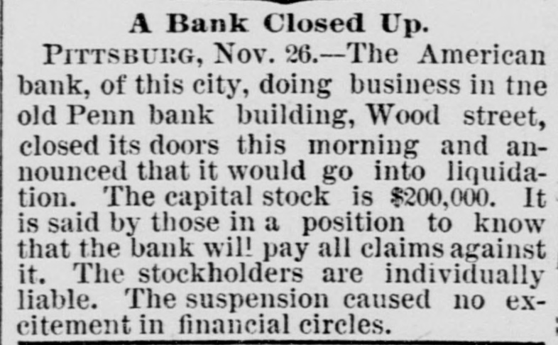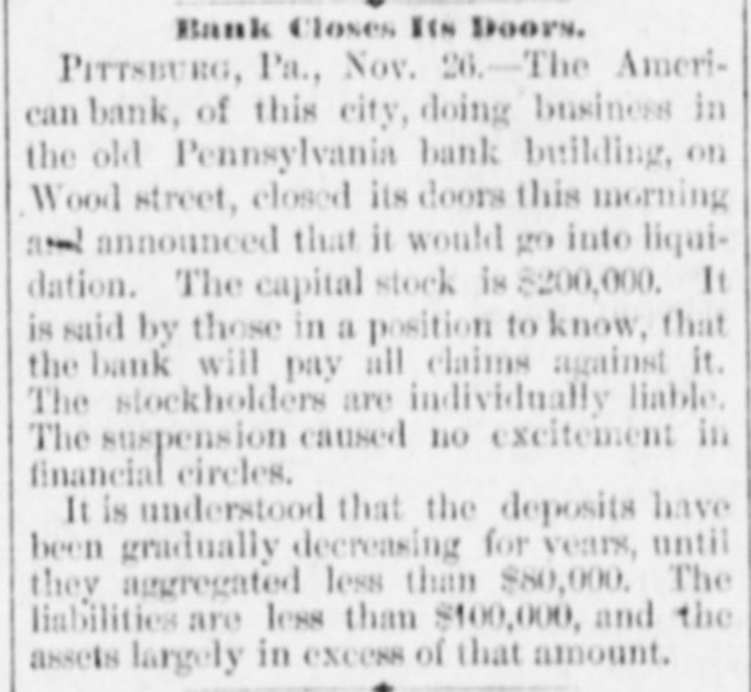 Bank Closes ITN Doors. PITTSBURG, Pa., Nov. 26. - The American bank, of this city, doing business in the old Pennsylvania bank building, on Wood street, closed its doors this morning and announced that it would go into liquidation. The capital stock is $200,000. It is said by those in a position to know. that the bank will pay all claims against it. The stockholders are individually liable. The suspension caused no excitement in financial circles. It is understood that the deposits have been gradually decreasing for years, until they aggregated less than $80,000. The liabilities are less than $100,000, and the assets largely in excess of that amount.