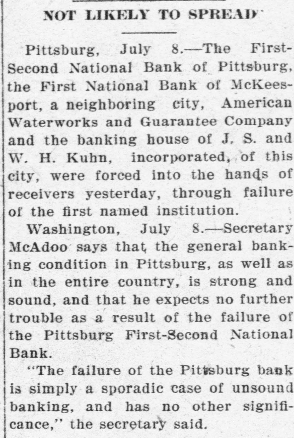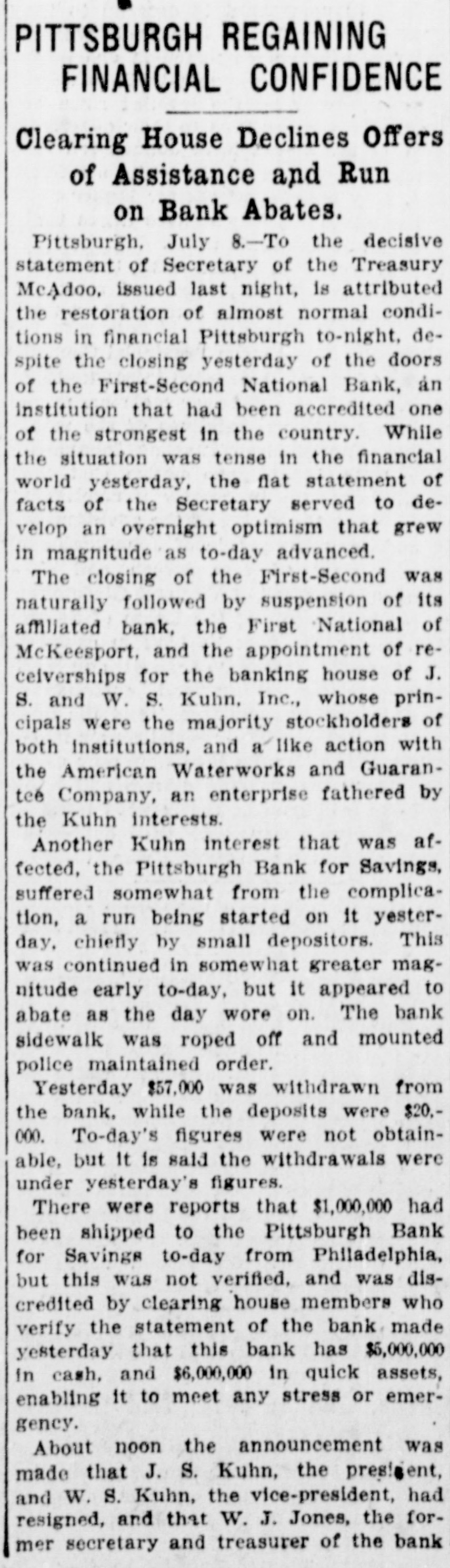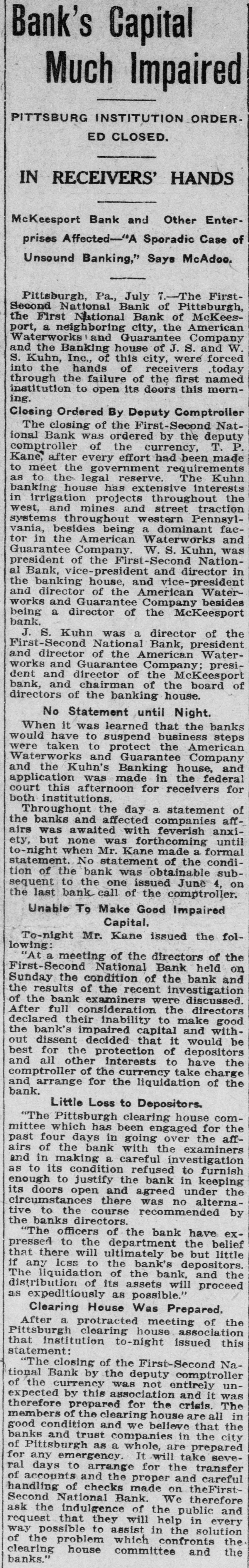 Comptroller Takes Charge First-Second National. Deposits Amount to Over Thirty Million Dollars. AM. WATERWORKS RECEIVERS Biggest Waterworks Company in Country Involved. Controls Eighty Plants-Some in Kansas Towns. RUN IS MADE ON THIRD BANK All Embarrassed Institutions Are Closely Allied. Former Department Men Hold Positions in Bank. Pittsburg, July 7.-The First-Second the secNational bank of Pittsburg, of the largest in the city and one closed tolargest ond in the country, was of by order of the comptroller bank day currency. The First National the of McKeesport, Pa., an allied institualso closed its doors. tion S. Kuhn and J. S. Kuhn own banks the controlling W. interests in both retheir closing led to persistent asked and that a receiver would be and ports the American Waterworks for Guaranty company, the largest with conof its kind in the country. which cern the Kuhns are prominently soon identifield, and the reports were more out. This concern controls the borne than forty waterworks plants in \ United Differences States. between the officials of First-Second bank and the treas- of the department over the character have sed the ury bank's assets are said to to the order closing its doors. No details of the differences have debeen announced by the treasury Firstpartment this afternoon. The conNational bank is a recent solidation Second of the First and Second Na- debanks of Pittsburg and has The tional posits of more than $30,000,000. suspension of the institution precip- for itated a run on the Pittsburg Pank Savings, of which J. S. Kuhn is president. Difficulty Long Standing. Differences of long standing with the treasury department concerning the s character and value of certain assets of of the former First National bank Pittsburg which was merged with the Second National bank last March unthe title of the First-Second Nader bank of Pittsburg, culminated intional morning in the closing of the this by order of Deputy Comptrolstitution ler of the Currency, T. P. Kane. and officers of the instituDirectors were in session all day yesterday tion most of last night with special bank and examiners sent here to investi- hour the bank. and at an early on gate morning notices were posted this the bank doors that it had been ordered closed. The Pittsburg clearing house association has taken charge of the situagenerally, and announces will no be tion further trouble. A statement issued by it later in the day. None of the officials of the bank make a statement this morning the would announcing that affairs were in of the government officials. hands The officers of the First-Second W. S. Nabank, of Pittsburg are: Young, tional Kuhn, president. and J. M. L. TellWilliam McConway, and Oscar is ing, vice presidents. Mr. Young also cashier. W. S. Kuhn also is vice president of American Waterworks and Guarthe anty company. of which J. S. Kuhn controls is president. The company waterworks plants in about States. eighty cities and towns in the United concapital stock of the various trolled The companies is about $73,000,000. McKeesport Bank Closes. First National bank of McKees- FirstThe an allied institution of the port, Second National bank of Pittsburg, closed its doors later in the day, posting this account notice: of the First-Second Na"On bank of Pittsburg asking for of a receiver, tional it is thought best for bank all for depositors to close his unsigned. our present." The notice was Ask the American Waterworks Receivers. the Application for a receiver for Waterworks and Guarantee court company American was filed in the federal 1:55 this afternoon. at The American Waterworks and Guarcompany is the largest operating United antee waterworks company in the 40 such States, controlling more than plants throughout the country. The concern is also largely interestin irrigation projects, electric interurban ed and electric lighting enterprises. the companies controlled by Among American Waterworks and Guarantee the company are: The St. Joseph, Kan. Mo. Water company; the Wichita, Water company; Louisiana, Mo., Water Arkansas Water company Ark., and Joplin Waterworks company, Little company; Rock, Joplin, Mo. Extensive Interests. J. S. and W. S. Kuhn, incorporated interests, bankers, known as the Kuhn a S. are incorporated in Delaware with capital stock of $500,000. James of is chairman of the board diJames Kuhn rectors and his brother, W. S. Kuhn Kuhn, is is vice president president. of the American Wateralso works and Guarantee company, with S. capital of $20,000,000. The and Kuhn W. inKuhn a is vice president. centered largely of late terests irrigation have projects in the west. They in control the West Pennsylvania also Traction and Water Power company,