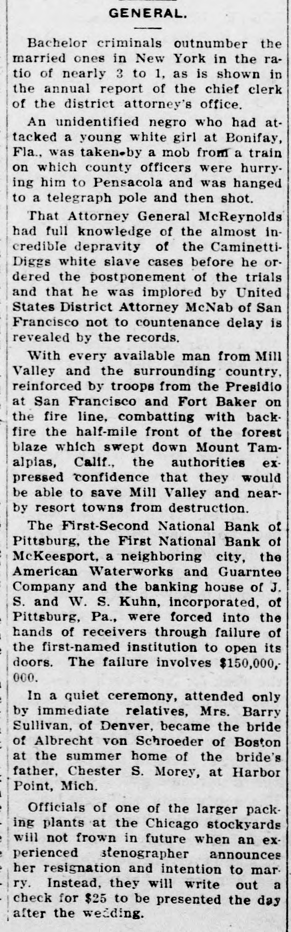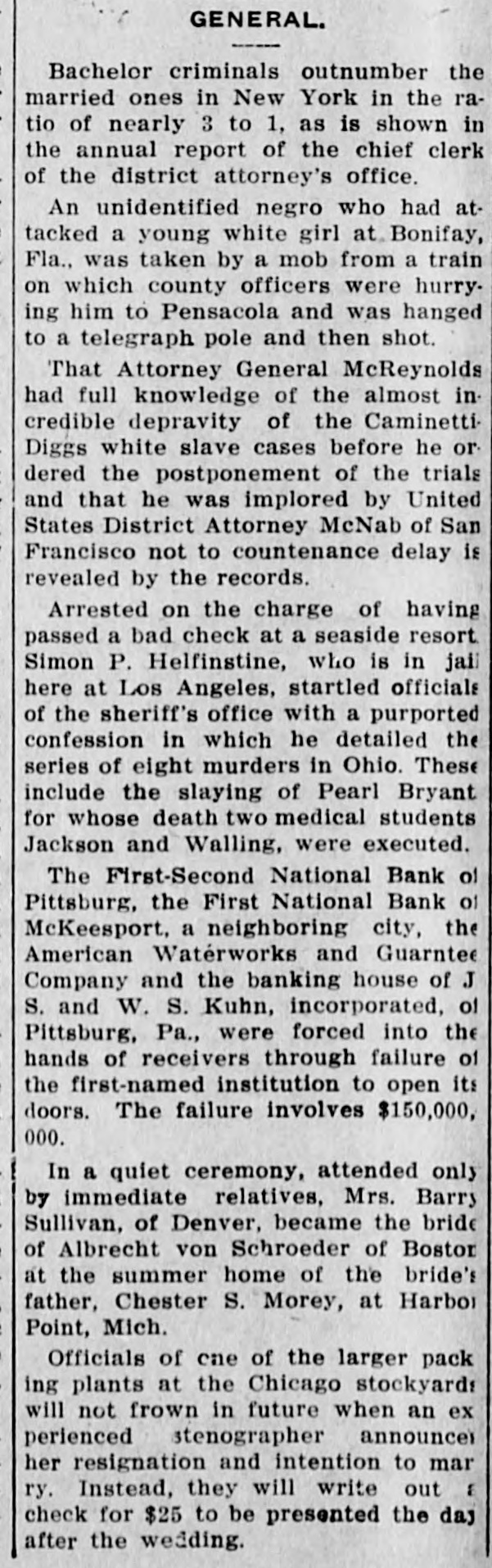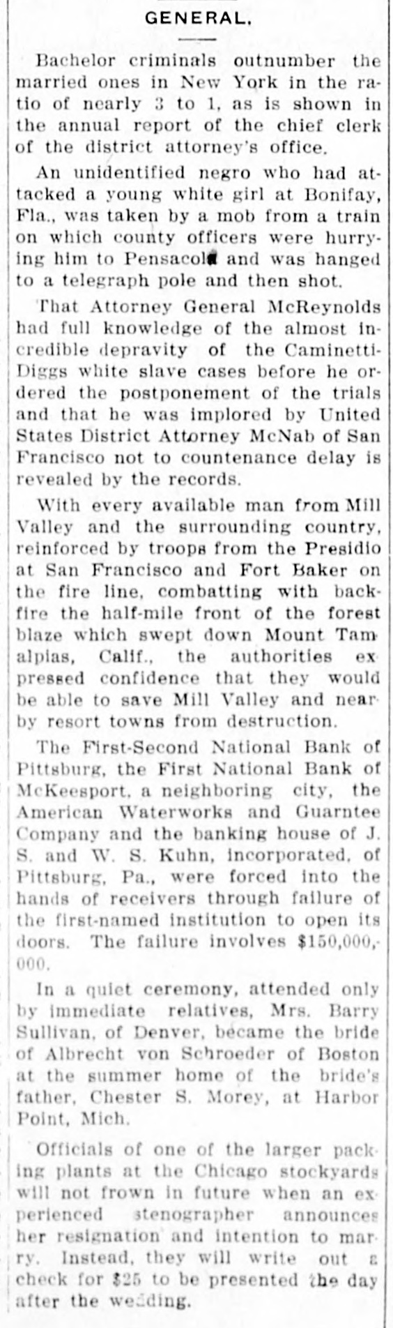 Comptroller Takes Charge First-Second National. Deposits Amount to Over Thirty Million Dollars. AM. WATERWORKS RECEIVERS Biggest Waterworks Company in Country Involved. Controls Eighty Plants-Some in Kansas Towns. RUN IS MADE ON THIRD BANK All Embarrassed Institutions Are Closely Allied. Former Department Men Hold Positions in Bank. Pittsburg, July 7.-The First-Second the secNational bank of Pittsburg, of the largest in the city and one closed tolargest ond in the country, was of by order of the comptroller bank day currency. The First National the of McKeesport, Pa., an allied institualso closed its doors. tion S. Kuhn and J. S. Kuhn own banks the controlling W. interests in both retheir closing led to persistent asked and that a receiver would be and ports the American Waterworks for Guaranty company, the largest with conof its kind in the country. which cern the Kuhns are prominently soon identifield, and the reports were more out. This concern controls the borne than forty waterworks plants in \ United Differences States. between the officials of First-Second bank and the treas- of the department over the character have sed the ury bank's assets are said to to the order closing its doors. No details of the differences have debeen announced by the treasury Firstpartment this afternoon. The conNational bank is a recent solidation Second of the First and Second Na- debanks of Pittsburg and has The tional posits of more than $30,000,000. suspension of the institution precip- for itated a run on the Pittsburg Pank Savings, of which J. S. Kuhn is president. Difficulty Long Standing. Differences of long standing with the treasury department concerning the s character and value of certain assets of of the former First National bank Pittsburg which was merged with the Second National bank last March unthe title of the First-Second Nader bank of Pittsburg, culminated intional morning in the closing of the this by order of Deputy Comptrolstitution ler of the Currency, T. P. Kane. and officers of the instituDirectors were in session all day yesterday tion most of last night with special bank and examiners sent here to investi- hour the bank. and at an early on gate morning notices were posted this the bank doors that it had been ordered closed. The Pittsburg clearing house association has taken charge of the situagenerally, and announces will no be tion further trouble. A statement issued by it later in the day. None of the officials of the bank make a statement this morning the would announcing that affairs were in of the government officials. hands The officers of the First-Second W. S. Nabank, of Pittsburg are: Young, tional Kuhn, president. and J. M. L. TellWilliam McConway, and Oscar is ing, vice presidents. Mr. Young also cashier. W. S. Kuhn also is vice president of American Waterworks and Guarthe anty company. of which J. S. Kuhn controls is president. The company waterworks plants in about States. eighty cities and towns in the United concapital stock of the various trolled The companies is about $73,000,000. McKeesport Bank Closes. First National bank of McKees- FirstThe an allied institution of the port, Second National bank of Pittsburg, closed its doors later in the day, posting this account notice: of the First-Second Na"On bank of Pittsburg asking for of a receiver, tional it is thought best for bank all for depositors to close his unsigned. our present." The notice was Ask the American Waterworks Receivers. the Application for a receiver for Waterworks and Guarantee court company American was filed in the federal 1:55 this afternoon. at The American Waterworks and Guarcompany is the largest operating United antee waterworks company in the 40 such States, controlling more than plants throughout the country. The concern is also largely interestin irrigation projects, electric interurban ed and electric lighting enterprises. the companies controlled by Among American Waterworks and Guarantee the company are: The St. Joseph, Kan. Mo. Water company; the Wichita, Water company; Louisiana, Mo., Water Arkansas Water company Ark., and Joplin Waterworks company, Little company; Rock, Joplin, Mo. Extensive Interests. J. S. and W. S. Kuhn, incorporated interests, bankers, known as the Kuhn a S. are incorporated in Delaware with capital stock of $500,000. James of is chairman of the board diJames Kuhn rectors and his brother, W. S. Kuhn Kuhn, is is vice president president. of the American Wateralso works and Guarantee company, with S. capital of $20,000,000. The and Kuhn W. inKuhn a is vice president. centered largely of late terests irrigation have projects in the west. They in control the West Pennsylvania also Traction and Water Power company,