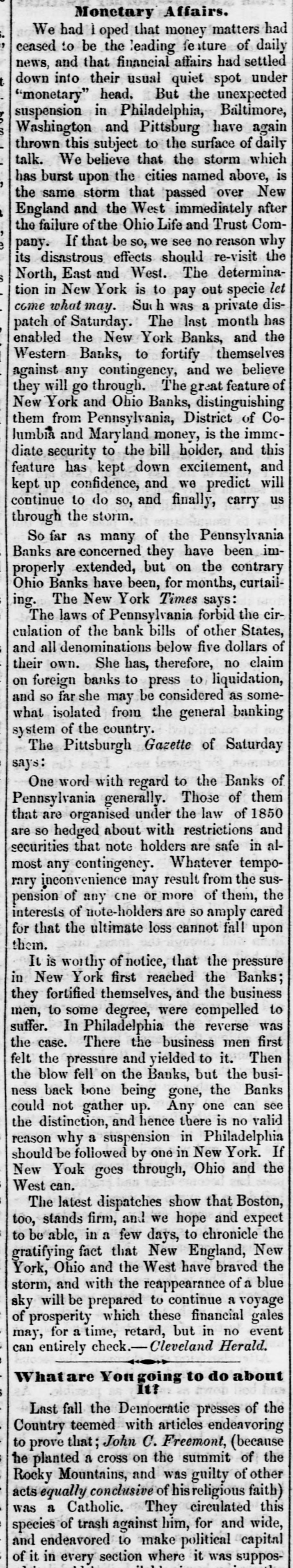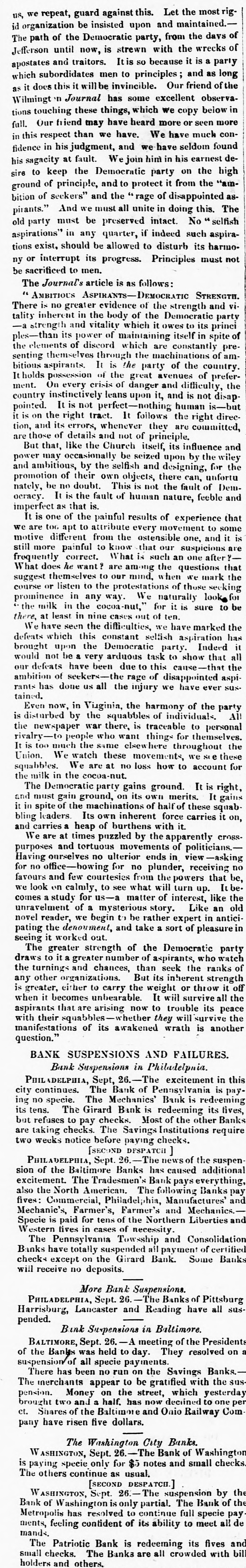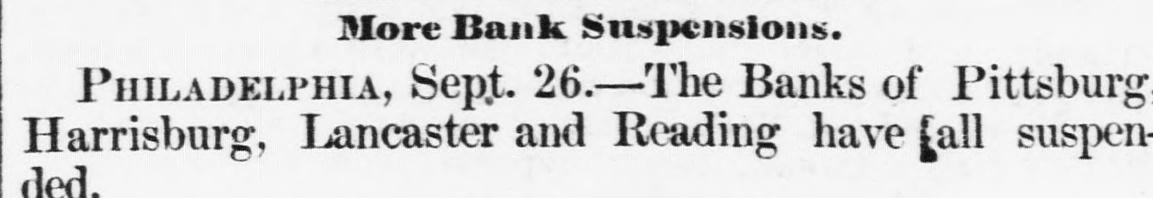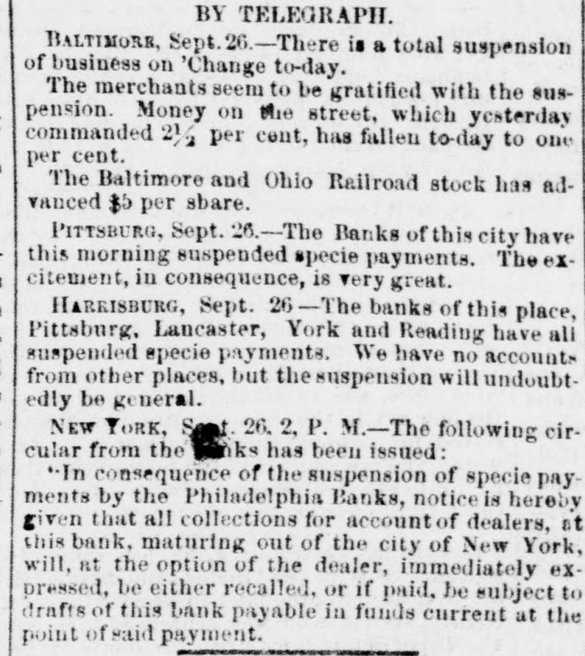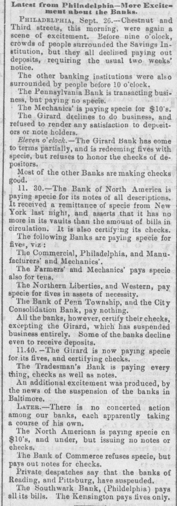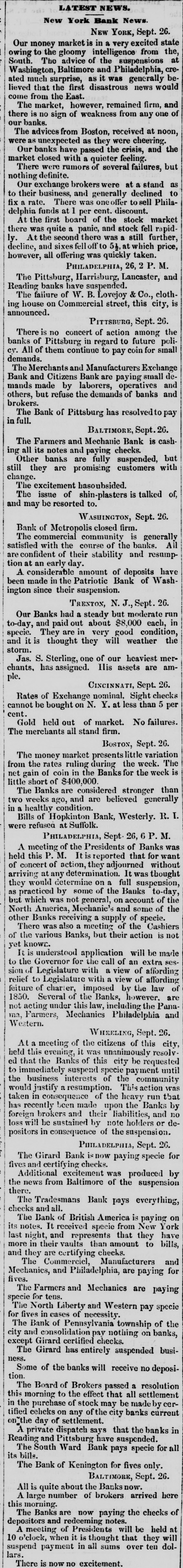 lieved that come from the East. The market, however, remained firm, and there is no sign of weakness from any one of our banks. The advices from Boston, received at noon, were as unexpected as they were cheering. Our banks have passed the crisis, and the market closed with a quieter feeling. There were rumors of several failures, but nothing definite. Our exchange brokers were at a stand as to their business, and generally declined to fix a rate. There was one offer to sell Philadelphia funds at 1 per cent. discount. At the first board of the stock market there was quite a panic, and stock fell rapid ly. At the second there was a still further, decline, and sixes fell off to 51, at which price, however, all offering was quickly taken. PHILADELPHIA, 26, 2 P. M. The Pittsburg, Harrisburg, Lancaster, and Reading banks have suspended. The failure of W. B. Lovejoy & Co., clothing house on Commercial street, this city, is announced. PITTSBURG, Sept. 26. There is no concert of action among the banks of Pittsburg in regard to future policy. All of them continue to pay coin for small demands. The Merchants and Manufacturers Exchange Bank and Citizens Bank are paying small demands made by laborers, operatives and others, but refuse the demands of banks and brokers. The Bank of Pittsburg has resolvedto pay in full. BALTIMORE, Sept. 26. The Farmers and Mechanic Bank is cashing all its notes and paying checks. Other banks are fully suspended, but still they are promising customers with change. The excitement hasoubsided. The issue of shin-plasters is talked of, and may be resorted to. WASHINGTON, Sept. 26. Bank of Metropolis closed firm. The commercial community is generally satisfied with the course of the banks. All are confident of their stability and resumption at an early day. A considerable amount of deposits have been made in the Patriotic Bank of Washington since their suspension. TRENTON, N. J., Sept. 26. Our Banks had a steady but moderate run to-day, and paid out about $8,000 each, in specie. They are in very good condition, and it is thought they will weather the storm. Jas. S. Sterling, one of our heaviest merchants, has assigned. Ilis assets are ample. CINCINNATI, Sept. 26. Rates of Exchange nominal, Sight checks cannot be bought on N. Y. at less than 5 per cent. Gold held out of market. No failures. The merchants all stand firm. Boston, Sept. 26. The money market presents little variation from the rates ruling during the week. The net gain of coin in the Banks for the week is little short of $400,000. The Banks are considered stronger than two weeks ago, and are believed generally in a healthy condition. Bills of Hopkinton Bank, Westerly. R. I. were refused at Suffolk. PHILADELPHIA, Sept. 26, 6 P. M. A meeting of the Presidents of Banks was held this P.M. It is reported that for want of concert of action, they adjourned without arriving at any determination. It was thought they would determine on a full suspension, as practiced by some of the Banks to-day, but which was not general, on account of the North America, Mechanic's and some of the other Banks receiving a supply of specie. There was also a meeting of the Cashiers of the various Banks, but their action is not yet known. It is understood application will be made to the Governor for the call of an extra session of Legislature with a view of affording relief to Legislature with a view of affording feiture of charter, imposed by the law of 1850. Several of the Banks, however, are not acting under this law, including the Panama, Farmers, Mechanics Philadelphia and Western. WHEELING, Sept. 26. At a meeting of the citizens of this city, held this evening, it was unanimously resolved that the Banks of this city be requested to immediately suspend specie payment until the business interests of the community would justify a resumption. This action was taken in consequence of the heavy run that has recently been made upon the Banks by foreign brokers and their liabilities, and no loss will be sustained by note holders or depositors in consequence of the suspension. PHILADELPHIA, Sept. 26. The Girard Bank isnow paying specie for fives and certifying checks. Additional excitement was produced by the news from Baltimore of the suspension there. The Tradesmans Bank pays everything, checks and all. The Bank of British America is paying on its notes. It received specie from New York last night, and represents that they have more in their vaults than amount to bills, and they are certifying checks. The Commerciel, Manufacturers and Mechanics, and Philadelphia, are paying for fives. The Farmers and Mechanics are paying specie for tens. The North Liberty and Western pay specie for fives in cases of necessity. The Bank of Pennsylvania township of the city and consolidation pay nothing on banks, except Girard certified checks. The Girard has entirely suspended business. Some of the banks will receive no deposition. The Board of Brokers passed a resolution this morning to the effect that all settlement in the purchase of stock may be made by certified cehcks on any of the city banks current on_the day of settlement. A private dispatch says that the banks in Reading and Pittsburg have suspended. The South Ward Bank pays specie for all its bills. The Bank of Kenington for fives only. BALTIMORE, Sept. 26. All is quite about the Banks now. A large number of brokers arrived here this morning. The Banks are now paying the checks of depositors and redeeming notes. A meeting of Presidents will be held at 10 o'clock, when it is thought that they will suspend payment in all sums over ten dollars. There is now no excitement.