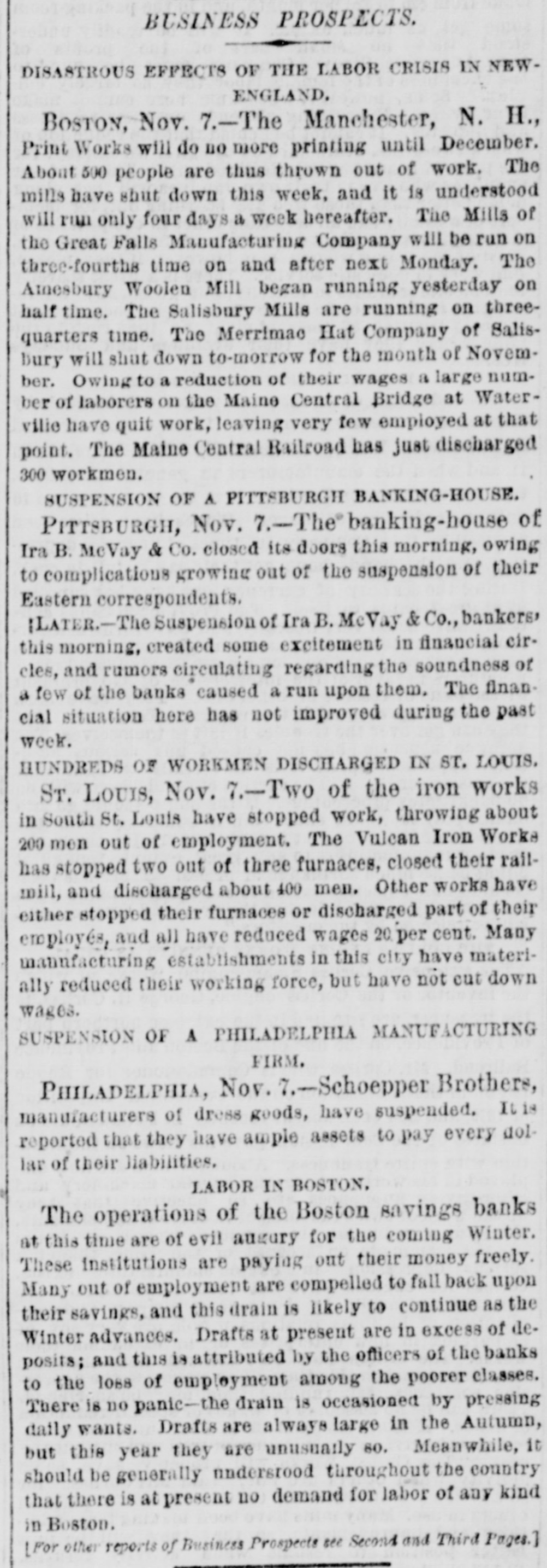 BUSINESS PROSPECTS. DISASTROUS EFFECTS OF THE LABOR CRISIS IN NEWENGLAND. BOSTON, Nov. 7.-The Manchester, N. H., Print Works will do no more printing until December. About 500 people are thus thrown out of work. The mills have shut down this week, and it is understood will run only four days a week hereafter. The Mills of the Great Falls Manufacturing Company will be run on three-fourths time on and after next Monday. The Amesbury Woolen Mill began running yesterday on half time. The Salisbury Mills are running on threequarters time. The Merrimae Hat Company of Salisbury will shut down to-morrow for the month of November. Owing to a reduction of their wages a large number of laborers on the Maine Central Bridge at Watervilie have quit work, leaving very few employed at that point. The Maine Central Railroad has just discharged 300 workmen. SUSPENSION OF A PITTSBURGH BANKING-HOUSE PITTSBURGH, Nov. 7.-The banking-house of Ira B. McVay & Co. closed its doors this morning, owing to complications growing out of the suspension of their Eastern correspondents. |LATER.-The Suspension of Ira B. McVay & Co., bankers this morning, created some excitement in financial circles, and rumors circulating regarding the soundness of a few of the banks caused a run upon them. The financial situation here has not improved during the past week. HUNDREDS OF WORKMEN DISCHARGED IN ST. LOUIS. ST. LOUIS, Nov. 7.-Two of the iron works in South St. Louis have stopped work, throwing about 200 men out of employment. The Vulcan Iron Works has stopped two out of three furnaces, closed their railmill, and discharged about 400 men. Other works have either stopped their furnaces or discharged part of their employés, and all have reduced wages 20 per cent. Many mannfacturing establishments in this city have materially reduced their working force, but have not cut down wages. SUSPENSION OF A PHILADELPHIA MANUFACTURING FIRM. PHILADELPHIA, Nov. 7.-Schoepper Brothers, manufacturers of dress goods, have suspended. It is reported that they have ample assets to pay every dollar of their liabilities. LABOR IN BOSTON. The operations of the Boston savings banks at this time are of evil augury for the coming Winter. These institutions are paying out their money freely. Many out of employment are compelled to fall back upon their savings, and this drain is likely to continue as the Winter advances. Drafts at present are in excess of deposits; and this is attributed by the officers of the banks to the loss of employment among the poorer classes. There is no panic-the drain is occasioned by pressing daily wants. Drafts are always large in the Autumn, but this year they are unusually 80. Meanwhile, it should be generally understood throughout the country that there is at present no demand for labor of any kind in Boston. For other reports of Business Prospects see Second and Third Pages.]