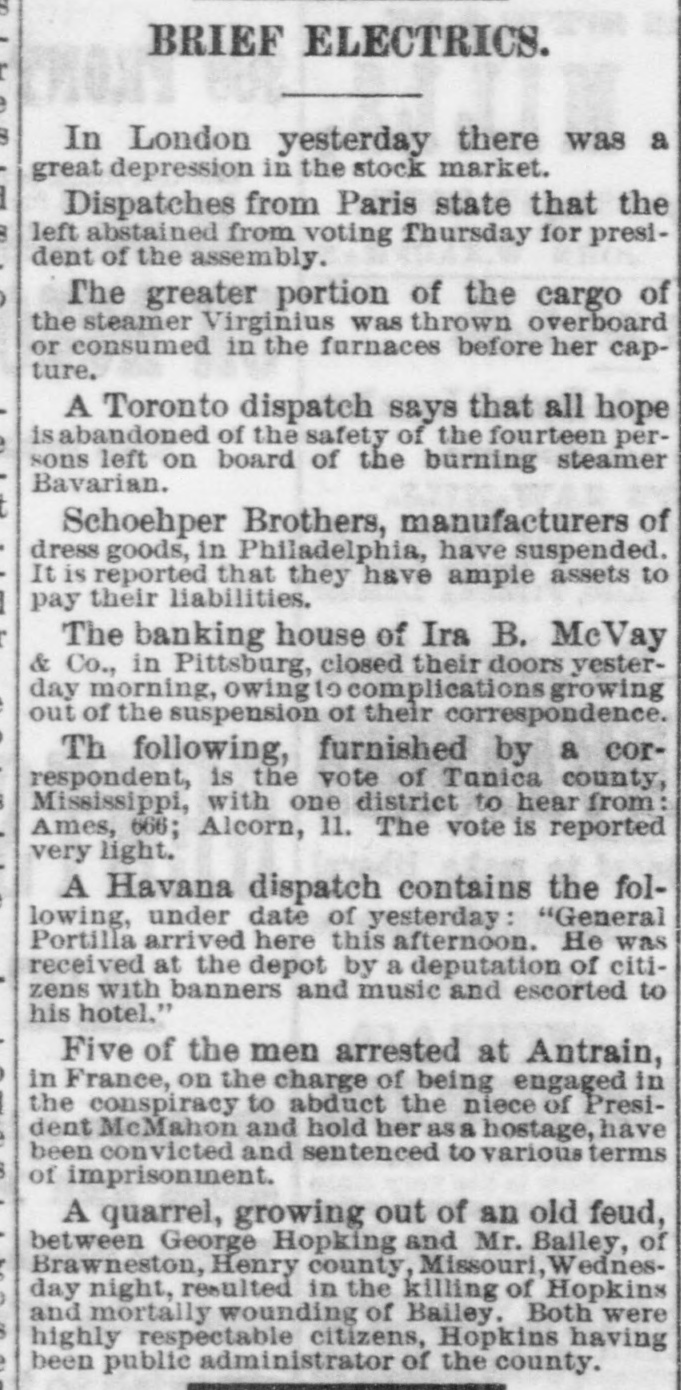 BRIEF ELECTRICS. In London yesterday there was a great depression in the stock market. Dispatches from Paris state that the left abstained from voting Thursday for president of the assembly. The greater portion of the cargo of the steamer Virginius was thrown overboard or consumed in the furnaces before her capture. A Toronto dispatch says that all hope is abandoned of the safety of the fourteen persons left on board of the burning steamer Bavarian. Schoehper Brothers, manufacturers of dress goods, in Philadelphia, have suspended. It is reported that they have ample assets to pay their liabilities. The banking house of Ira B. McVay & Co., in Pittsburg, closed their doors yesterday morning, owing to complications growing out of the suspension of their correspondence. Th following, furnished by a correspondent, is the vote of Tunica county, Mississippi, with one district to hear from: Ames, 666; Alcorn, 11. The vote is reported very light. A Havana dispatch contains the following, under date of yesterday: "General Portilla arrived here this afternoon. He was received at the depot by a deputation of citizens with banners and music and escorted to his hotel." Five of the men arrested at Antrain, in France, on the charge of being engaged in the conspiracy to abduct the niece of President McMahon and hold her as a hostage, have been convicted and sentenced to various terms of imprisonment. A quarrel, growing out of an old feud, between George Hopking and Mr. Balley, of Brawneston, Henry county, Missouri, Wednesday night, resulted in the killing of Hopkins and mortally wounding of Bailey, Both were highly respectable citizens, Hopkins having been public administrator of the county.
