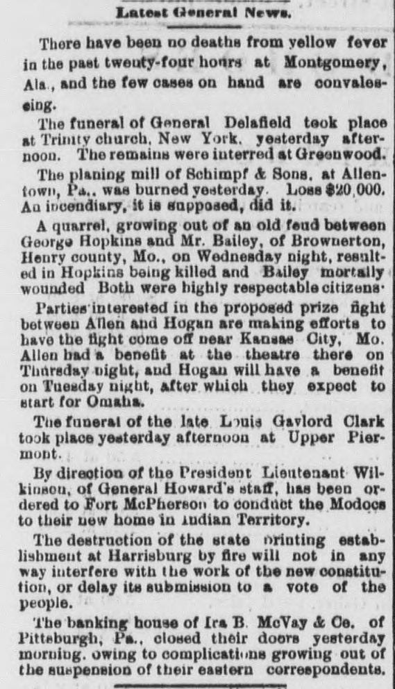 Latest General News. There have been no deaths from yellow fever in the past twenty-four hours at Montgomery, Ala., and the few cases on hand are convaleseing. The funeral of General Delafield took place at Trimity church, New York. yesterday afternoon. The remains were interred at Greenwood. The planing mill of Schimpf & Sons. at Allentown, Pa.. was burned yesterday. Loss $20,000. Aa incendiary, it is supposed, did it. A quarrel, growing out of an old feud between George Hopkins and Mr. Bailey, of Brownerton, Henry county, Mo., on Wednesday night, resulted in Hopkins being killed and Bailey mortally wounded Both were highly respectable citizens. Parties interested in the proposed prize fight between Allen and Hogan are making efforts to have the fight come off near Kansae City, Mo. Allen had a benefit at the theatre there on Thursday night, and Hogan will have a benefit on Tuesday night, after which they expect to start for Omaha. The funeral of the late Louis Gavlord Clark took place yesterday afternoon at Upper Piermont. By direction of the President Lieutenant Wilkinson, of General Howard's staff, has been ordered to Fort McPherson to conduct the Modocs to their new home in indian Territory. The destruction of the state printing establishment at Harrisburg by fire will not in any way interfere with the work of the new constitution, or delay its submission to a vote of the people. The banking house of Ira B. McVay & Ce. of Pittsburgh, Pa., closed their doors yesterday morning. owing to complications growing out of the suspension of their eastern correspondents.