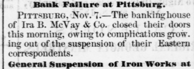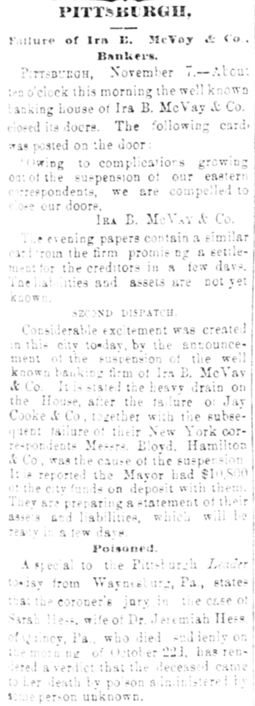 PITTSHURGH, Failure of Ira E. McWay & Co. Bankers. PITTSBURGH, November 7.-About ten o'clock this morning the well known banking house of Ira B. McVay & Co. closed its doors. The following card, was posted on the door owing to complications growing out of the suspension of our eastern correspondents, we are compelled to close our doore. IRA B. McVAY & Co. The evening papers contain 3. similar card froin the firm promis ng & settlement for the creditors in 8 few davs The liabilities and assets are not yet KOOWD. SECOND DISPATCH Considerable excitement was created in this city to day bv the ansounce. ment of the suspension of the well known banking firm of Ira B. McVay & Co It is stated the heavy drain on the House, after the failure or Jay Cooke & Co, together with the subsequent failure of their New York correspondents Mesers. Bloyd. Hamilton & Co. was the cause of the suspension It a reported the Mayor had $10,800 o: the city funds on deposit with them. They are preparing a statement of their assets and liabilities, which will be ready S few dave Poisoned A special to the Pittsburgh Leader 10-dav from Waynesburg, Pa., states that the coroner's jary in the case of Sarah Hear wife of Dr Jeremiah Hess of Quincy, Pa. who died suddenly on the mord ng of October 22d. basien= iered a verdict that the deceased came to her death by po son stope perso on unknown.