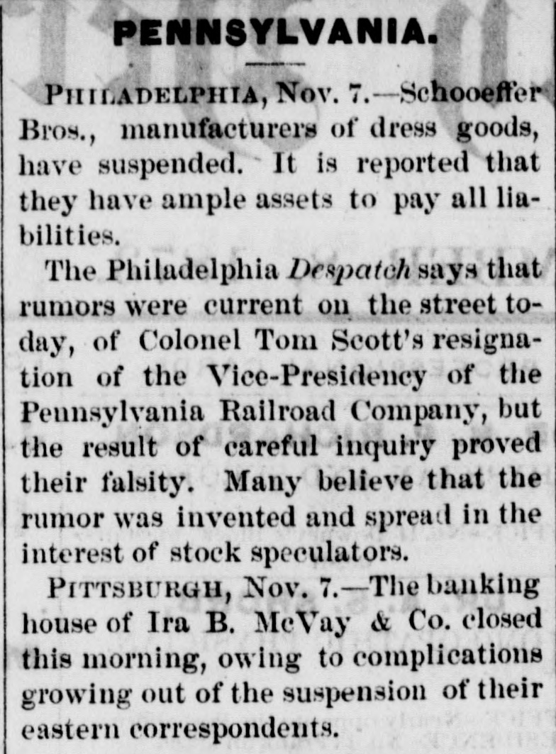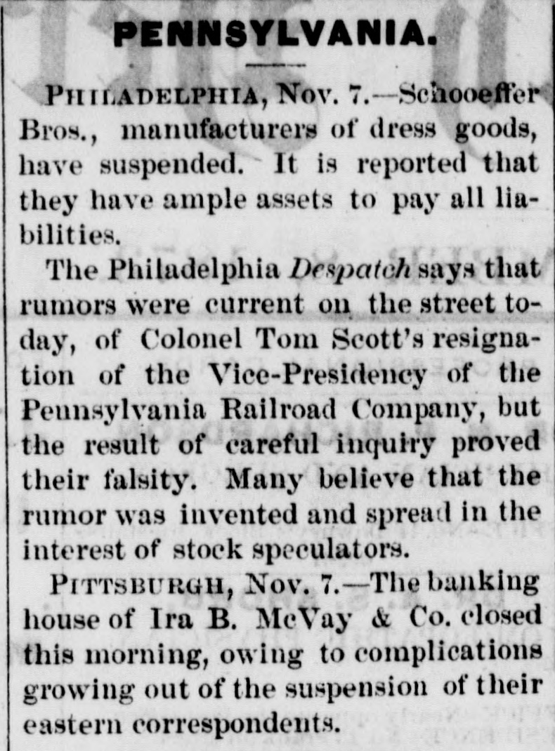 PENNSYLVANIA. PHILADELPHIA, Nov. 7.-Schooeffer Bros., manufacturers of dress goods, have suspended. It is reported that they have ample assets to pay all liabilities. The Philadelphia Despatch says that rumors were current on the street today, of Colonel Tom Scott's resignation of the Vice-Presidency of the Pennsylvania Railroad Company, but the result of careful inquiry proved their falsity. Many believe that the rumor was invented and spread in the interest of stock speculators. PITTSBURGH, Nov. 7.-The banking house of Ira B. McVay & Co. closed this morning, owing to complications growing out of the suspension of their eastern correspondents.
