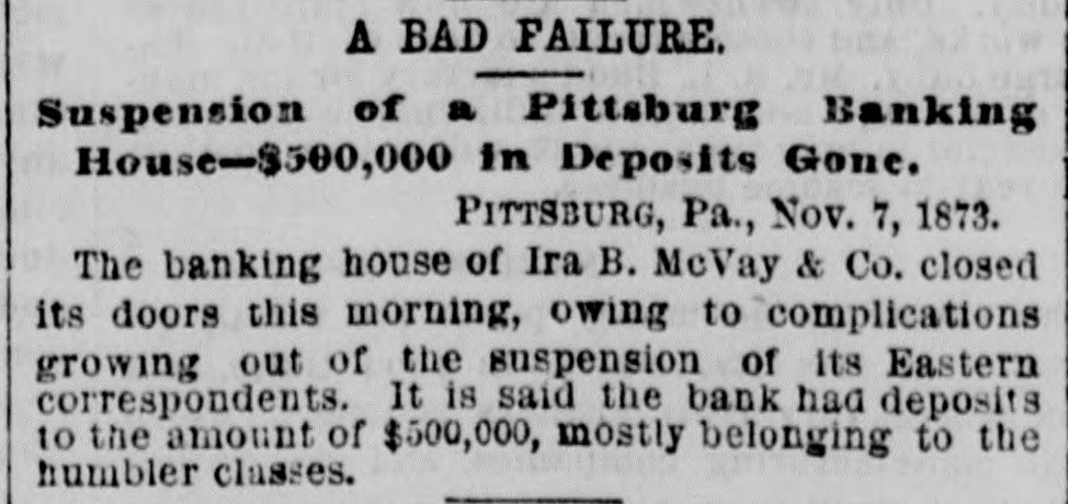 A BAD FAILURE. Suspension of a Pittsburg Banking House-$500,000 in Deposits Gone. PITTSBURG, Pa., Nov. 7, 1873. The banking house of Ira B. McVay & Co. closed its doors this morning, owing to complications growing out of the suspension of Its Eastern correspondents. It is said the bank had deposits to the amount of $500,000, mostly belonging to the numbler classes.