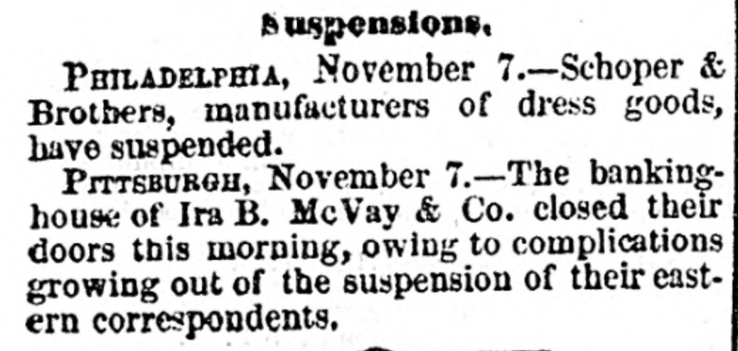 suspensions, PHILADELPHIA, November 7.-Schoper & Brothers, manufacturers of dress goods, have suspended. PITTSBURGH, November 7.-The bankinghouse of Ira B. McVay & Co. closed their doors this morning, owing to complications growing out of the suspension of their eastern correspondents.