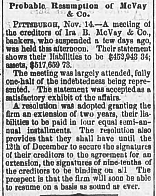 Probable Resumption of McVay & Co. PITTSBURGH, Nov. 14.-A meeting of the creditors of Ira B. McVay & Co., bankers, who suspended a few days ago, was held this afternoon. Their statement shows their liabilities to be $452,943 34; assets, $517,659 73. The meeting was largely attended, fully one-halt of the indebtedness being represented. The statement was accepted as a satisfactory exhibit of the affairs. A resolution was adopted granting the firm an extension of two years, their liabilities to be paid in four equal semi-annual installments. The resolution also provides that they shall have until the 12th of December to secure the signatures of their creditors to the agreement for an extension, the signatures of nine-tenths of the creditors to be binding on all The prospect is that the firm will soon be able to resume on a basis as sound as ever.