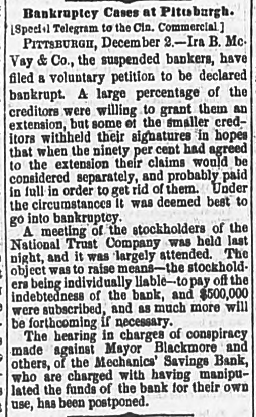 Bankruptcy Cases at Pittsburgh. [Specifil Telegram to the Cin. Commercial] PITTSBURGH, December 2.-Ira B. Mc. Vay & Co., the suspended bankers, have filed a voluntary petition to be declared bankrupt. A large percentage of the creditors were willing to grant them an extension, but some et the smaller creditors withheld their signatures in hopes that when the ninety per cent had agreed to the extension their claims would be considered separately, and probably paid in full in order to get rid of them. Under the circumstances It was deemed best to go into bankruptcy. A meeting of the stockholders of the National Trust Company was held last night, and it was 'largely attended. The object was to raise means-the stockholders being individually liable-to pay off the indebtedness of the bank, and $500,000 were subscribed, and as much more will be forthcoming if necessary. The hearing in charges of conspiracy made against Mayor Blackmore and others, of the Mechanics' Savings Bank, who are charged with having manipulated the funds of the bank for their own use, has been postponed.