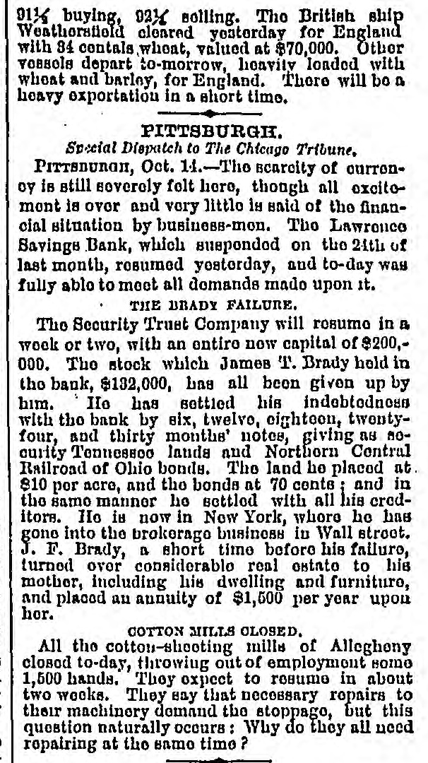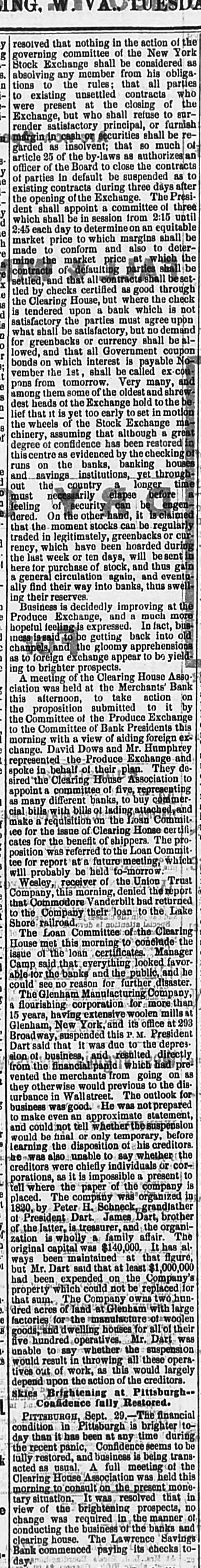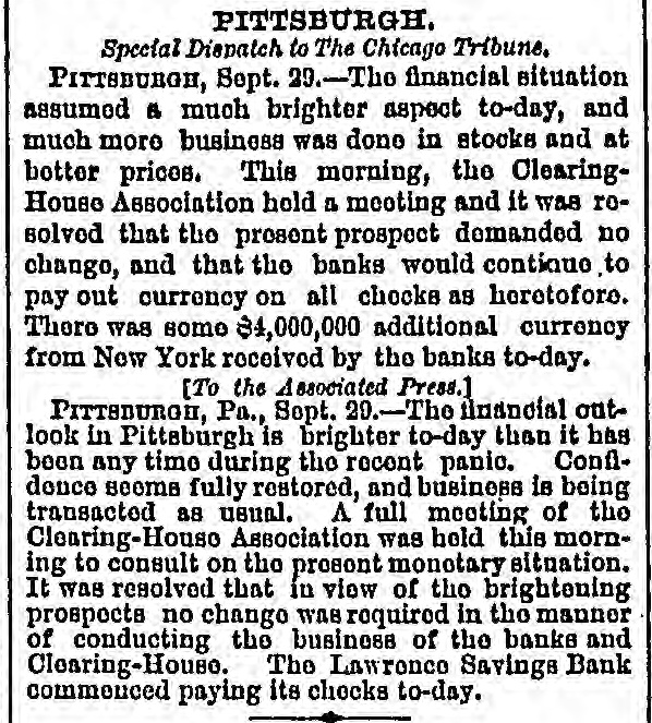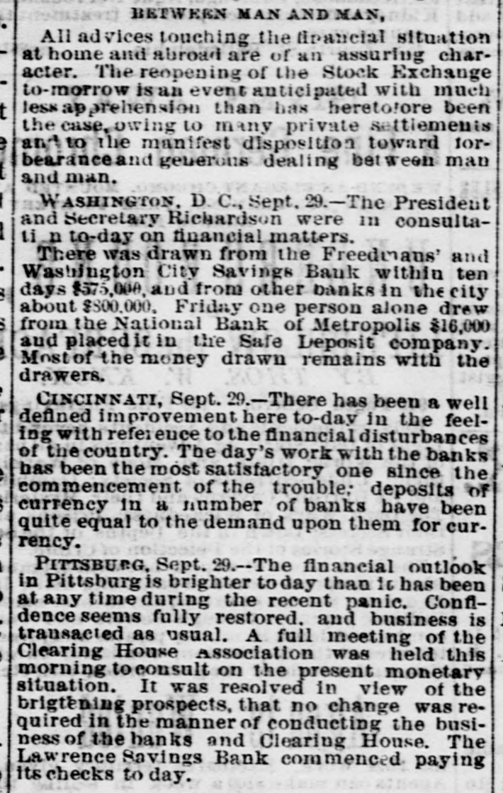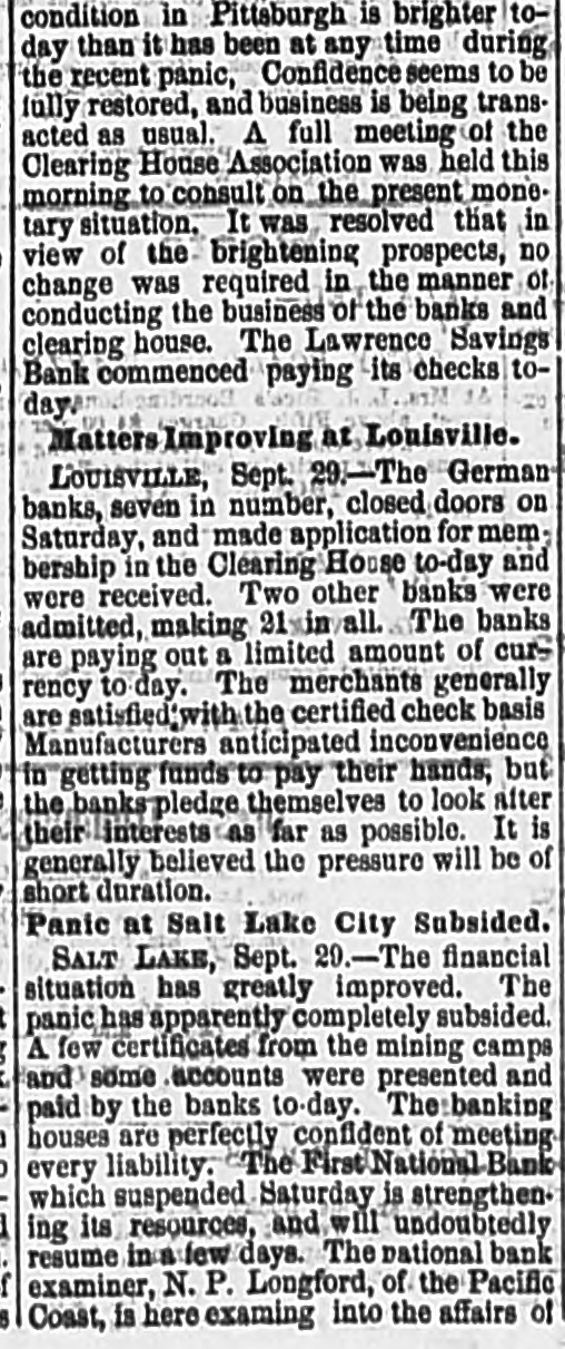 [Signed Citizen's Bank N. o. Nt Bank Bank America Union Ntl Bank Germania Nu Bank Ntl Banking A TeutoniaN Bank Canal Bank Mutual Ntl Bank Louisiana Ntl Bank America Hibern an Ntl Bank People's Bank Bank of Lafayette State Ntl Bank Fike Bro &Co, bankers Clearing house certificates at the rate of 75 cents on the dollar will be issued collaterals deposited by banks and certified checks. Clearing house checks will be used instead of currency. STATEMENT FROM CLEWS & CO. NEW YORK, Sept. 25,-Henry Clews & Co. state that the liabilities which their London house describes as incurred on the account of the New York house, are largely acceptances under commercial credits for the account of various merchants in this city and elsewhere, to whom draits will be returned and who will meet them, being prepared to do so by having goods placed in their posses sion, against which acceptances were given. The apparent liabilities, there tore. of the London house will be reduced to the extent to which the acceptances under these credits are provided by the parties on whose account they were issued BRIGHTER SKIES AT PITTABURGH-LARGE ARRIVAL OF GREENBACKS. PITTSBURGH, Sept. 25 -It is learned from authentic sources that three hundred and fifty thousand dollars in greenbacks arrived here to day from New York and Washington city Other large sums are on the way which are expected to arrive to-morrow, and there is a well founded hope that the greenback stringency will be over by Saturday morning if not soon er. The entire outlook is more bright and there is reason for saying that the temporary derangement of our financial houses is to be of very brief duration. The run on the various Savings banks has stopped and no new movement of the kind is apprehended. The Security Trust Company is making arrangements to resume. The officers say that they expect to be open by Monday next. The Lawrence Savings Bank, which suspended yesterday, will resume in a few days RUMORED ASSIGNMENT AT TOLEDO. TOLEDO, Sept. 25.-The rumor is current o-night that the banking house of Krans & Smith, has made an assignment. A FLURRY AT INDIANAPOLIS. INDIANAPOLIS Sept. Considerable excitement was caused here this morning by the announcement of the precautionary measures adopted by the Chicago and Cincinnati banks, which were at first reported as having totally suspended, end this excitement was heightened at noon by the suspension of the private banking house of Woolen, Webb & Co. Owing mainly to the return of their draits on the suspended Trust Company of New York and public confidence became so shaken that there was quite a heavy run on Ritzingers' Bank and on the Indianapolis Savings Banks by a class of generally small depositors, and some few persons withdrew their money from other banks The First National Bank, instead of closing at the usual hour, kept open an hour later to give any depos itor an opportunity to withdraw his money if he wished, and when it closed it had received moremoney than it had paid out. The unquestionable solvency of all our banks, together with the fearless way in which they met the excitement, seems to have sent home the crowds who thronged the streets after the banks had closed in a better state of feeling. and it is now anticipated that there will be no fur ther trouble. The banks previous to the excitement had, after a conference together, decided to go ahead in the usual way, and this determination will be carried out. AMOUNT OF BONDS PURCHASED NEW YORK, Sept. actual dis bursement of greenbacks for the purchase of bonds by the Sub-Treasury, since Sat Furday, is $13,300,000 There is a rumor that the Jersey City Savings Bank closed this morning Hoboken banks are all quiet, and there has been no run on the Savings banks of Brooklyn or this city, to-day. AT SUSPENSION OF A BUSINESS HOUSE ATLANTA ATLANTA, Sept. 25.-The Dollar Sav ings Bank of this city suspended to-day. BANK SUSPENSION AT NEWARK, N. J. NEWARK, N. J., Jept. 25.-The State Bank of New Brunswick suspended to day. This is the bank that was crippled by the irregularities of Appletons cash ier. THE BALTIMORE BANKS TAKING IN SAIL CITY FINANCIAL INSTITUTIONS AND COMMERCE ON A HEALTHY BASIS. BALTIMORE, Sept. 5-The officers of the associated banks of Baltimore met this afternoon and resolved in view of the present financial situation not to pay out money on checks except what may be re quired for legitimate business purposes of the banks and to certify all good checks which can be used in business transac tions. It is confidently believed here that the banks in the city were never in a more sound condition than at the present, and their action this afternoon Is recognized as a prudent precaution against any panic. The mercantile and commercial interests of the city, while suffering in some de gree from the general pressure and tight ness in money are regarded as being on safe and sound basis. The trade fs very limited. The feeling to-day sympathizing with favorable dispatches from New York, is much better than for several days previous, and it is confidently expected that business will soon revive. THE LITTLE ROCK BANKS HOLDING OUT. LITTLE ROCK, ARK., Sept. 5.-The ex citement over the city currency and the reported suspension of banks in Memphis caused unusual excitement. Financial matters are the only topic of conversation. Nearly all the merchants refused to take the city money to-day, and through out the day there was a heavy run on the banks by the depositors. As yet they have met every demand promptly, and claim that they can weather the storm.