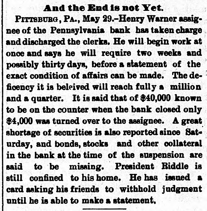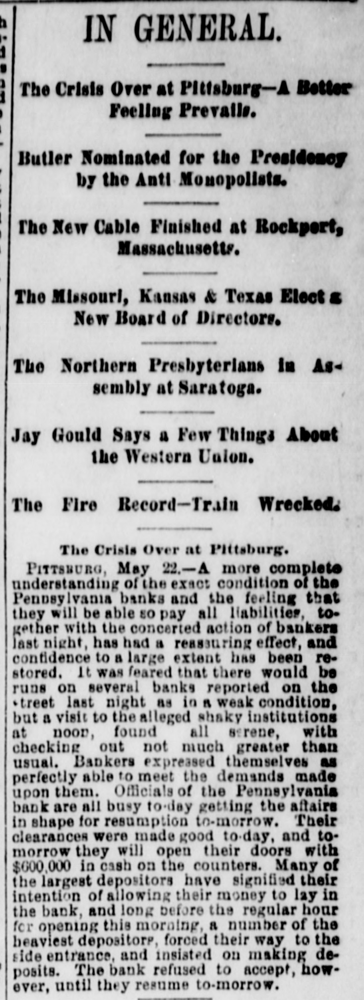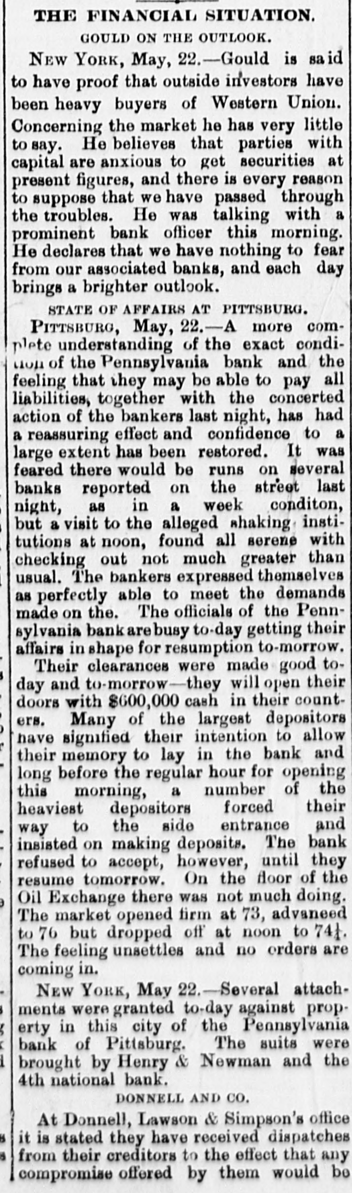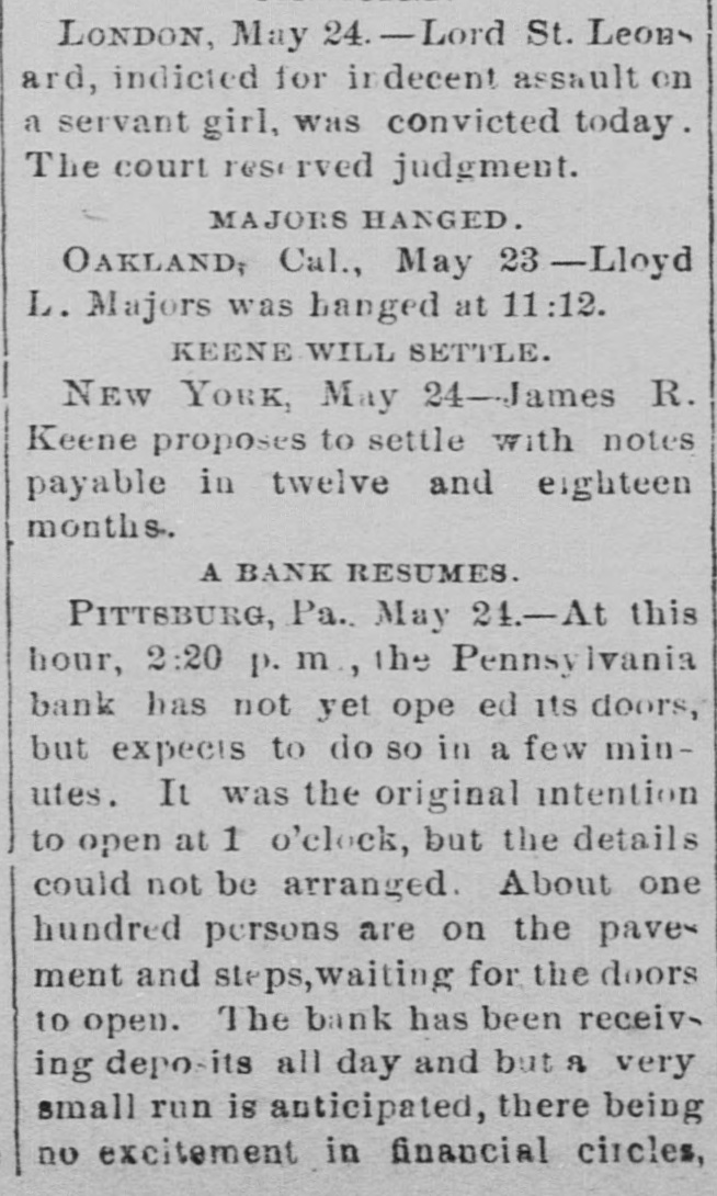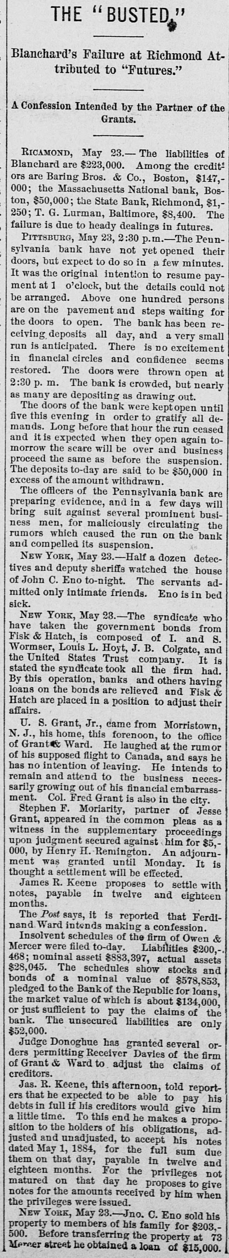 THE BUSTED " Blanchard's Failure at Richmond Attributed to "Futures." A Confession Intended by the Partner of the Grants. RICAMOND, May 23.- The liabilities of Blanchard are $223,000. Among the credit ors are Baring Bros. & Co., Boston, $147,000; the Massachusetts National bank, Boston, $50,000; the State Bank, Richmond, $1,250; T.G. Lurman, Baltimore, $8,400. The failure is due to heady dealings in futures. PITTSBURG, May 23, 2:30 p.m.-The Pennsylvania bank have not yet opened their doors, but expect to do so in a few minutes. It was the original intention to resume payment at 1 o'clock, but the details could not be arranged. Above one hundred persons are on the pavement and steps waiting for the doors to open. The bank has been receiving deposits all day, and a very small run is anticipated. There is no excitement in financial circles and confidence seems restored. The doors were thrown open at 2:30 p. m. The bank is crowded, but nearly as many are depositing as drawing out. The doors of the bank were keptopen until five this evening in order to gratify all demands. Long before that hour the run ceased and it is expected when they open again tomorrow the scare will be over and business proceed the same as before the suspension. The deposits to-day are said to be $50,000 in excess of the amount withdrawn. The officers of the Pennsylvania bank are preparing evidence, and in a few days will bring suit against several prominent business men, for maliciously circulating the rumors which caused the run on the bank and compelled its suspension. NEW YORK, May 23.-Half a dozen detectives and deputy sheriffs watched the house of John C. Eno to-night. The servants admitted only intimate friends. Eno is in bed sick. NEW YORK, May 23.-The syndicate who have taken the government bonds from Fisk & Hatch, is composed of I. and S. Wormser, Louis L. Hoyt, J.B. Colgate, and the United States Trust company. It is stated the syndicate took all the firm had. By this operation, banks and others having loans on the bonds are relieved and Fisk & Hatch are placed in a position to adjust their affairs. U. S. Grant, Jr., came from Morristown, N.J., his home, this forenoon, to the office of Grant Ward. He laughed at the rumor of his supposed flight to Canada, and says he has no intention of leaving. He intends to remain and attend to the business necessarily growing out of his financial embarrassment. Col. Fred Grant is also in the city. Stephen F. Moriarity, partner of Jesse Grant, appeared in the common pleas as a witness in the supplementary proceedings upon judgment secured against him for $5,000, by Henry H. Remington. An adjournment was granted until Monday. It is thought a settlement will be effected. James R. Keene proposes to settle with notes, payable in twelve and eighteen months. The Post says, it is reported that Ferdinand Ward intends making a confession. Insolvent schedules of the firm of Owen & Mercer were filed to-day. Liabilities $200,468; nominal asseti $883,397, actual assets $28,045. The schedules show stocks and bonds of a nominal value of $578,853, pledged to the Bank of the Republic for loans, the market value of which is about $134,000, or just sufficient to pay the claims of the bank. The unsecured liabilities are only $52,000. Judge Donoghue has granted several orders permitting Receiver Davies of the firm of Grant & Ward to adjust the claims of creditors. Jas. R. Keene, this afternoon, told reporters that he expected to be able to pay his debts in full if his creditors would give him a little time. To this end he makes a proposition to the holders of his obligations, adjusted and unadjusted, to accept his notes dated May 1, 1884, for the full sum due them on that day, payable in twelve and eighteen months. For the privileges not matured on that day he proposes to give notes for the amounts received by him when the privileges were issued. NEW YORK, May 23.-Jno. C. Eno sold his property to members of his family for $203,500. Before transferring the property at 73 Mercer street he obtained a loan of $15,000.