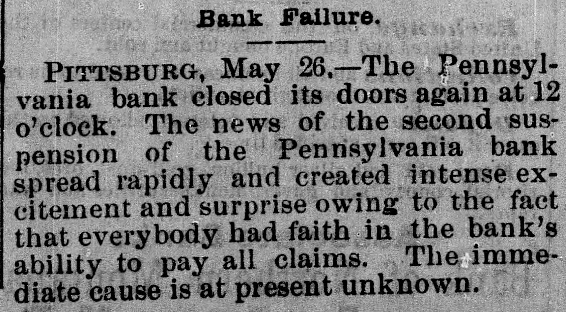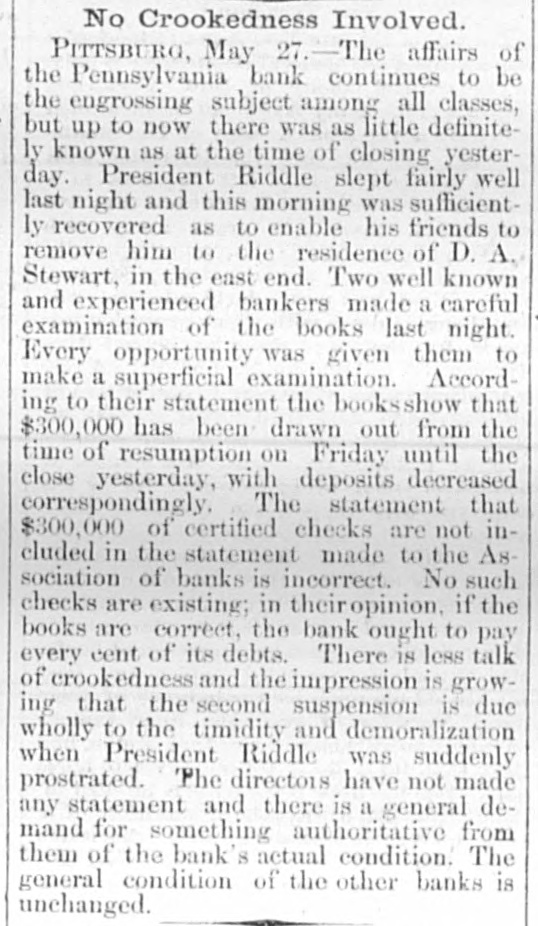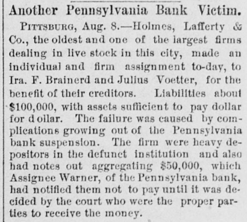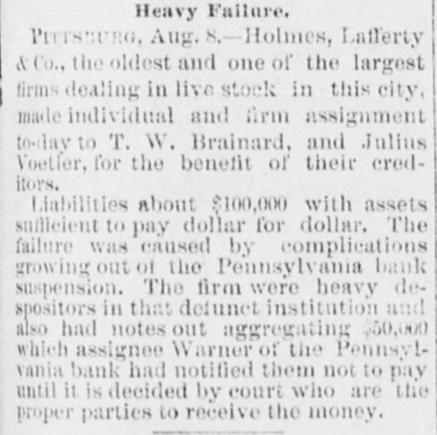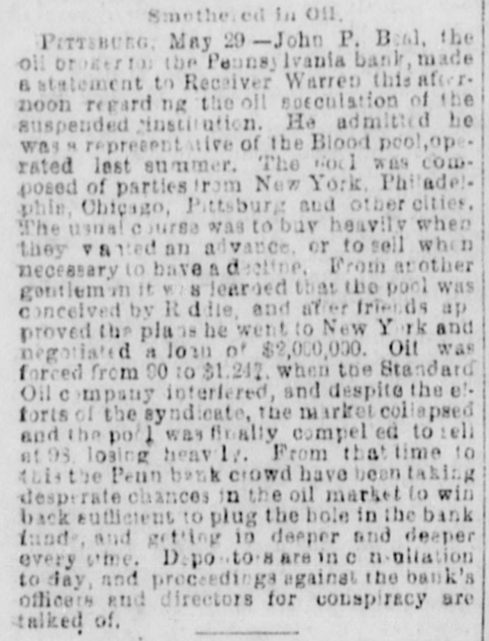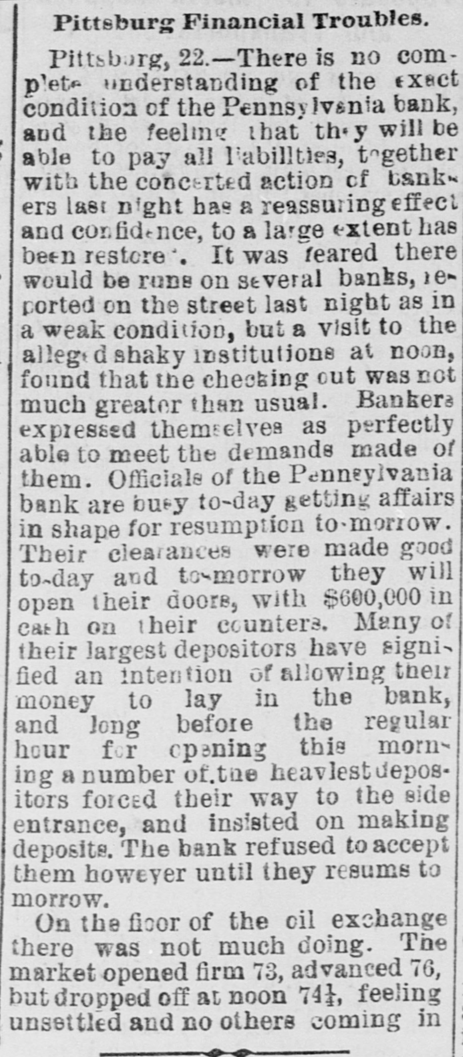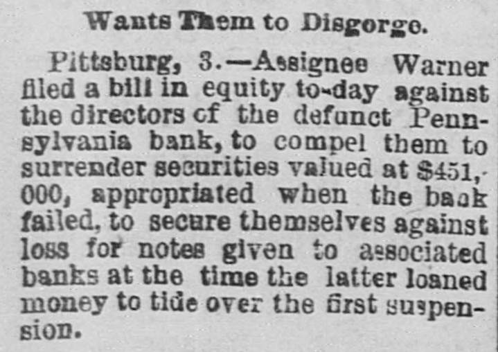THE BUSTED " Blanchard's Failure at Richmond Attributed to "Futures." A Confession Intended by the Partner of the Grants. RICAMOND, May 23.- The liabilities of Blanchard are $223,000. Among the credit ors are Baring Bros. & Co., Boston, $147,000; the Massachusetts National bank, Boston, $50,000; the State Bank, Richmond, $1,250; T.G. Lurman, Baltimore, $8,400. The failure is due to heady dealings in futures. PITTSBURG, May 23, 2:30 p.m.-The Pennsylvania bank have not yet opened their doors, but expect to do so in a few minutes. It was the original intention to resume payment at 1 o'clock, but the details could not be arranged. Above one hundred persons are on the pavement and steps waiting for the doors to open. The bank has been receiving deposits all day, and a very small run is anticipated. There is no excitement in financial circles and confidence seems restored. The doors were thrown open at 2:30 p. m. The bank is crowded, but nearly as many are depositing as drawing out. The doors of the bank were keptopen until five this evening in order to gratify all demands. Long before that hour the run ceased and it is expected when they open again tomorrow the scare will be over and business proceed the same as before the suspension. The deposits to-day are said to be $50,000 in excess of the amount withdrawn. The officers of the Pennsylvania bank are preparing evidence, and in a few days will bring suit against several prominent business men, for maliciously circulating the rumors which caused the run on the bank and compelled its suspension. NEW YORK, May 23.-Half a dozen detectives and deputy sheriffs watched the house of John C. Eno to-night. The servants admitted only intimate friends. Eno is in bed sick. NEW YORK, May 23.-The syndicate who have taken the government bonds from Fisk & Hatch, is composed of I. and S. Wormser, Louis L. Hoyt, J.B. Colgate, and the United States Trust company. It is stated the syndicate took all the firm had. By this operation, banks and others having loans on the bonds are relieved and Fisk & Hatch are placed in a position to adjust their affairs. U. S. Grant, Jr., came from Morristown, N.J., his home, this forenoon, to the office of Grant Ward. He laughed at the rumor of his supposed flight to Canada, and says he has no intention of leaving. He intends to remain and attend to the business necessarily growing out of his financial embarrassment. Col. Fred Grant is also in the city. Stephen F. Moriarity, partner of Jesse Grant, appeared in the common pleas as a witness in the supplementary proceedings upon judgment secured against him for $5,000, by Henry H. Remington. An adjournment was granted until Monday. It is thought a settlement will be effected. James R. Keene proposes to settle with notes, payable in twelve and eighteen months. The Post says, it is reported that Ferdinand Ward intends making a confession. Insolvent schedules of the firm of Owen & Mercer were filed to-day. Liabilities $200,468; nominal asseti $883,397, actual assets $28,045. The schedules show stocks and bonds of a nominal value of $578,853, pledged to the Bank of the Republic for loans, the market value of which is about $134,000, or just sufficient to pay the claims of the bank. The unsecured liabilities are only $52,000. Judge Donoghue has granted several orders permitting Receiver Davies of the firm of Grant & Ward to adjust the claims of creditors. Jas. R. Keene, this afternoon, told reporters that he expected to be able to pay his debts in full if his creditors would give him a little time. To this end he makes a proposition to the holders of his obligations, adjusted and unadjusted, to accept his notes dated May 1, 1884, for the full sum due them on that day, payable in twelve and eighteen months. For the privileges not matured on that day he proposes to give notes for the amounts received by him when the privileges were issued. NEW YORK, May 23.-Jno. C. Eno sold his property to members of his family for $203,500. Before transferring the property at 73 Mercer street he obtained a loan of $15,000.