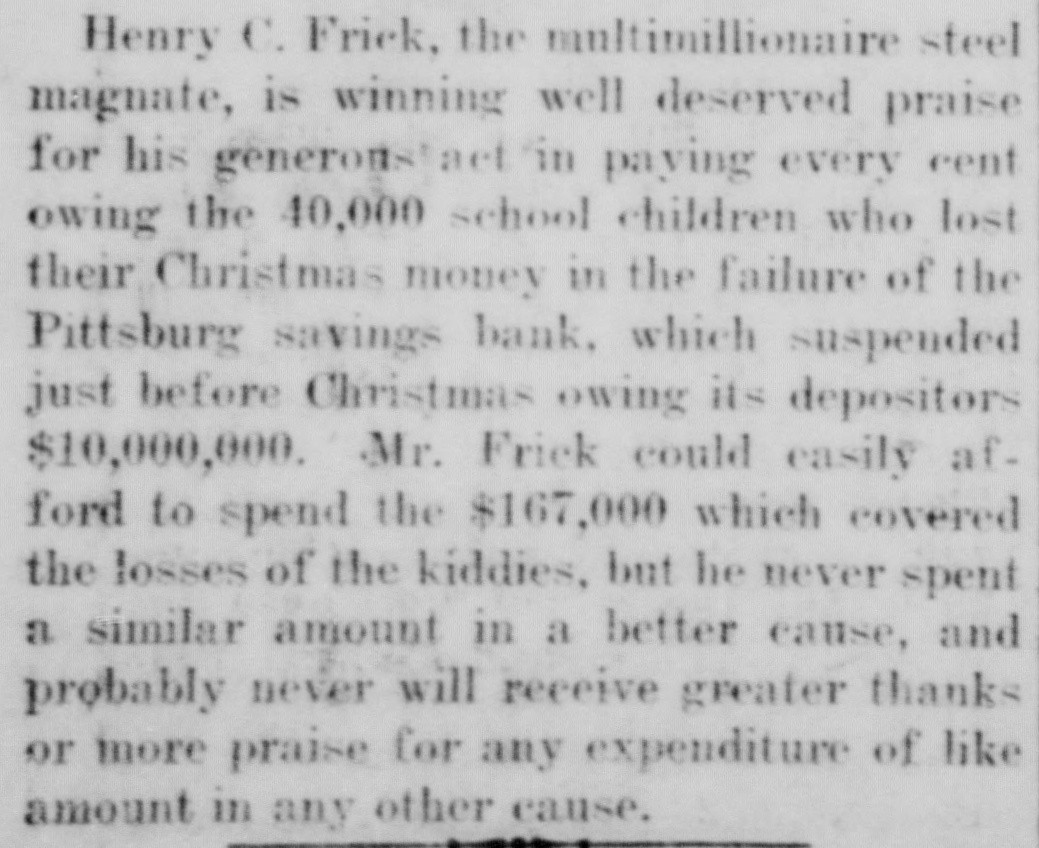 Henry C. Frick, the multimillionaire steel magnate, is winning well deserved praise for his generonstact in paying every cent owing the 40,000 school children who lost their Christmas money in the failure of the Pittsburg savings bank, which suspended just before Christmas owing its depositors $10,000,000. Mr. Frick could easily afford to spend the $167,000 which covered the losses of the kiddies, but he never spent a similar amount in a better cause, and probably never will receive greater thanks or more praise for any expenditure of like amount in any other cause.