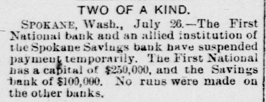 Fortress Monroe. The increase in national bank circulation during July SO far has been $5,868,750. Charles McGinnis, of Princeville, III., was killed by a freight train at Peoria Alexander Blessing of Wesley City, ill, was killed by a runaway horse at Peoria. Canadian speculators have lost $5.00,000 by the recent decline in the values of stocks. A dozen buildings in the vicinity of Concord, N. H., were demolished by 6 wind storm. John A. Porter, a switchman, feil nd had his head cut off by an engine at Terre Haute. The Bates mills at Lewiston, Me., withh be closed on August 5, and 1,500 nen will be made idle. Bunco men secured $3,600 from Robert Elliott, a rich farmer living near Fayette City, Pa. The First National bank and the Spokane Savings bank at Spokane, Wash., have suspended. Robert Morrison, a stockman, was tatally injured at Crawfordsville, Ind., by his horse falling on him. The Pittsburg wire works at Braddock, Pa., have been closed, and 500 men are out of employment. The 12-year-old daughter of James Ld. Pennington, of Hillsboro, III., was atally burned while cooking dinner. H. B. Nemitz, who stole $24,000 from the Swiss commission at the world's tair, was arrested in Toronto, Ont. Twenty-seven persons were poisoned y impure milk at Louisville. Three of the sufferers are in a serious conMtion Four hundred houses were wrecked and many persons killed and injured by an explosion of a powder magazine at Canton, China. The government surveying corps in me Cherokee strip has located and staked off nine sites for county seats, and also located two land offices. The Obermann Brewing company, Milwaukee, involved in the suspension of "Mitchell's bank," made an assignment to protect creditors. Four kinds of ice-cream made in one day by the Nuber Brothers, conrectioners of Brooklyn, N. Y., poisoned between twenty and thirty people, some of them seriously. A mob of unemployed workmen at Denver took Dan Arata, the murderer of B. C. Lightfoot, from jail and anged him to a tree. A Cheyenne, Wyoming, dispatch says It is understood that Senator Beckwith has resigned and that A. L. New, recently appointed internal revenue collector for Colorado and Wyoming, will be his successor. Howard Mutchler (dem.) has been elected to congress from the eighth Pennsylvania district to fill the vacaney caused by the death of his father. Dr. R. L. Watkins, of New York, has had himself inoculated with the baceiltus of consumption in order to test nis theory that consumption is not contagious. George N. Carman, principal of the St. Paul high school, has been chosen associate professor and dean of the preparatory department of the university of Chicago. Governor Altgeld has offered a re"yard of $200 each for the apprehension and conviction of the members of the mob that lynched Bradshaw at Kingston on July 19. It is reported that United States Senator A. C. Beckwith, of Wyoming, is about to resign in consequence of at quarrel with Governor Osborne regardng federal anpointments