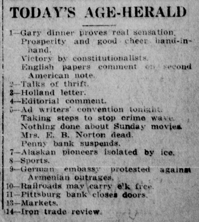 TODAY'S AGE-HERALD 1 Gary dinner proves real sensation. Prosperity and good cheer hand-inhand. Victory by constitutionalists English papers comment en second American note. 2 -Talks of thrift. 3-Holland letter. 4-Editorial comment. 5--Ad writers' convention tonight. Taking steps to stop crime wave Nothing done about Sunday movies Mrs. E. B. Norton dead. Penny bank suspends. 7-Alaskan pioneers isolated by ice. S Sports. 9-German embassy protested against Armenian outrages, 10-Railroads may carry e'k free. 11-Pittsburg bank closes doors. 18-Markets. 14-Iron trade review.