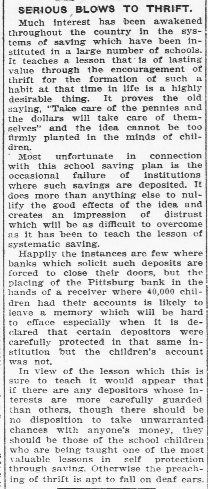 Happily the instances are few where banks which solicit such deposits are forced to close their doors, but the placing of the Pittsburg bank in the hands of a receiver where 40,000 children had their accounts is likely to leave a memory which will be hard to efface especially when it is declared that certain depositors were carefully protected in that same institution but the children's account was not.