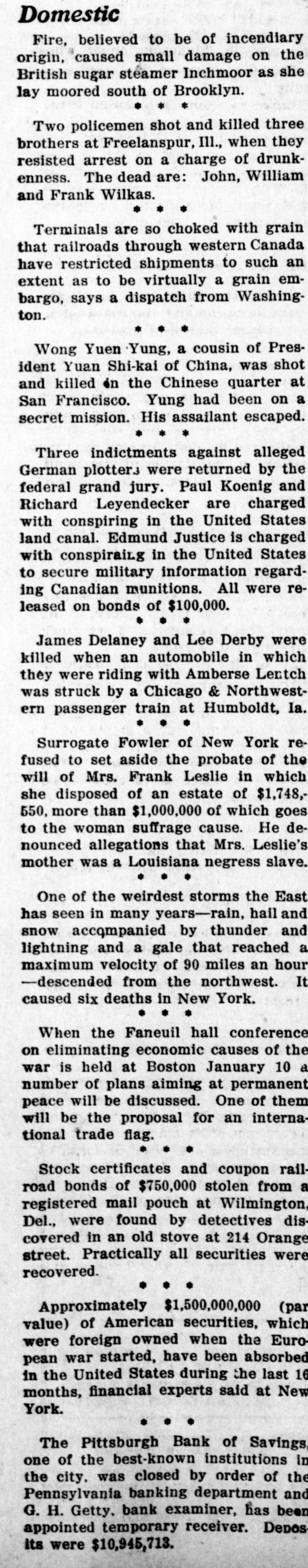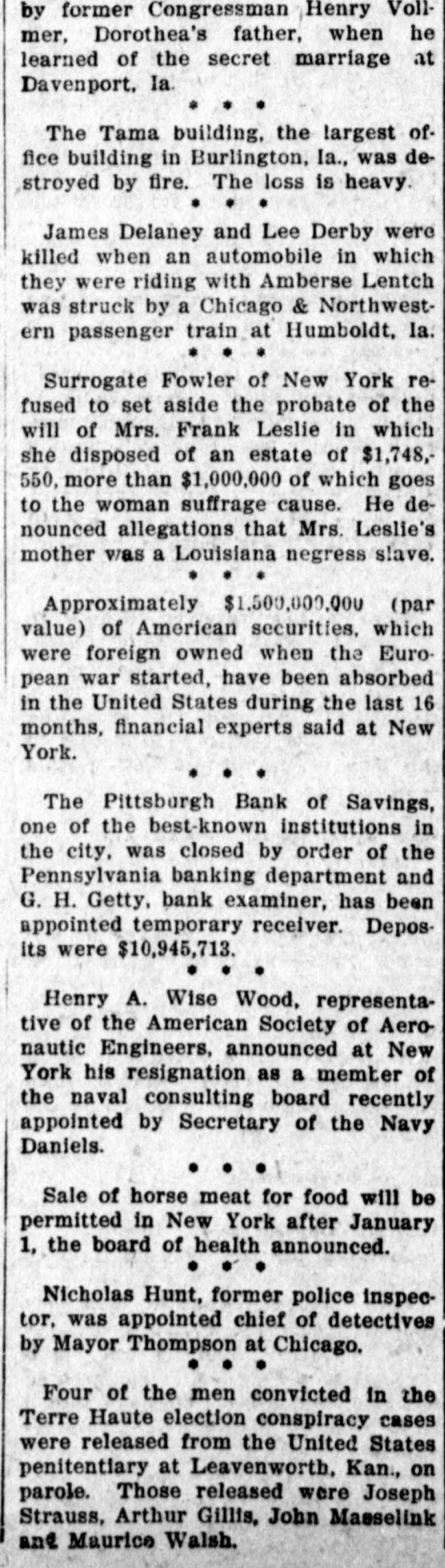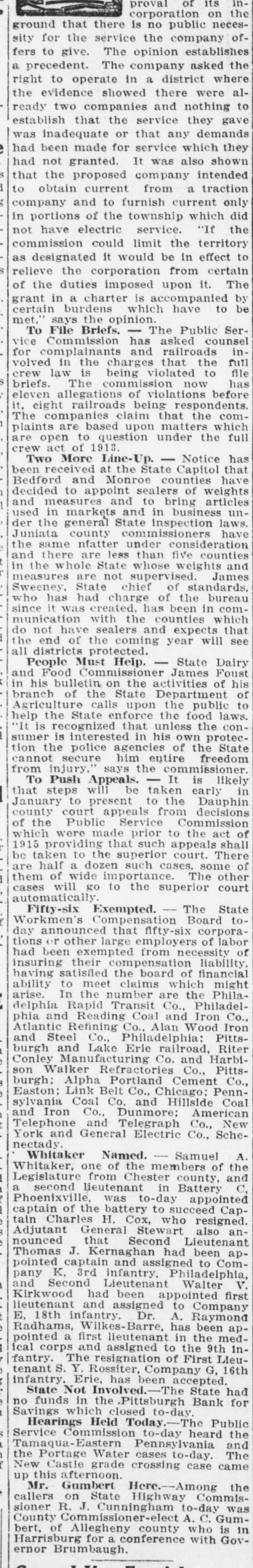 proval or its corporation on t ground that there is no public nece sity for the service the company ( fers to give. The opinion establish a precedent. The company asked t right to operate in a district whe the evidence showed there were ready two companies and nothing establish that the service they ga was inadequate or that any deman had been made for service which th had not granted. It was also sho that the proposed company intend to obtain current from a tracti company and to furnish current or in portions of the township which o not have electric service. "If t commission could limit the territo as designated it would be in effect relieve the corporation from certa of the duties imposed upon it. T grant in a charter is accompanied certain burdens which have to met," says the opinion. To File Briefs. - The Public Se vice Commission has asked count for complainants and railroads volved in the charges that the r f crew law is being violated to h briefs. The commission now eleven allegations of violations befo it, eight railroads being responden The companies claim that the con plaints are based upon matters whi are open to question under the f crew act of 1913. Two More Line-Up. - Notice h been received at the State Capitol th Bedford and Monroe counties ha decided to appoint sealers of weigh and measures and to bring artic used in markets and in business u der the general State inspection lav Juniata county commissioners ha the same nfatter under considerati and there are less than five counti in the whole State whose weights a measures are not supervised. Jam Sweeney, State chief of standard who has had charge of the bure since it was created. has been in con munication with the counties whi do not have sealers and expects th the end of the coming year will S all districts protected. People Must Help. - State Dai and Food Commissioner James For in his bulletin on the activities of ] branch of the State Department Agriculture calls upon the public help the State enforce the food lav "It is recognized that unless the co sumer is interested in his own prote tion the police agencies of the Sta cannot secure him entire freedo from injury," says the commission To Push Appeals. - It is like that steps will be taken early January to present to the Dauph county court appeals from decisio of the Public Service Commissi which were made prior to the act 1915 providing that such appeals sh be taken to the superior court. The are half a dozen such cases. some them of wide importance. The oth cases will go to the superior cou automatically. Fifty-six Exempted. - The Sta Workmen's Compensation Board t day announced that fifty-six corpor tions or other large employers of lab had been exempted from necessity insuring their compensation liabili having satisfied the board of financ ability to meet claims which mig arise. In the number are the Phil delphia Rapid Transit Co., Philad phia and Reading Coal and Iron C Atlantic Refining Co., Alan Wood Ir and Steel Co., Philadelphia; Pit burgh and Lake Erie railroad, Rit Conley Manufacturing Co. and Harl son Walker Refractories Co., Pit burgh; Alpha Portland Cement C Easton: Link Belt Co., Chicago; Pen sylvania Coal Co. and Hillside Co and Iron Co., Dunmore; Americ Telephone and Telegraph Co., N York and General Electric Co., Sch nectady. Whitaker Named. - Samuel Whitaker, one of the members of t Legislature from Chester county, a a second lieutenant in Battery Phoenixville, was to-day appoint captain of the battery to succeed Ca tain Charles H. Cox, who resigne Adjutant General Stewart also a nounced that Second Lieutena Thomas J. Kernaghan had been a pointed captain and assigned to Co pany K, 3rd infantry, Philadelph and Second Lieutenant Walter Kirkwood had been appointed fir lieutenant and assigned to Compa E, 18th infantry. Dr. A. Raymo Radhams, Wilkes-Barre, has been a pointed a first lieutenant in the me ical corps and assigned to the 9th 1 fantry. The resignation of First Lie tenant S. Y. Rossiter, Company G, 16 infantry, Erie, has been accepted. State Not Involved.-The State h no funds in the .Pittsburgh Bank f Savings which closed to-day. Hearings Held Today-The Pub Service Commission to-day heard t Tamaqua-Eastern Pennsylvania a the Portage Water cases to-day. T Castle
