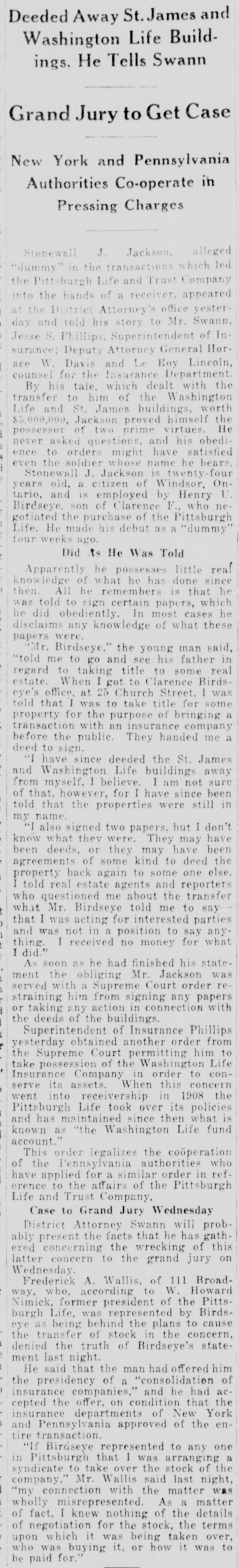 Deeded Away St. James and Washington Life Buildings, He Tells Swann Grand Jury to Get Case New York and Pennsylvania Authorities Co-operate in Pressing Charges Stonewall J. Jackson, alleged "dummy" in the transactions which led the Pittsburgh Life and Trust Company into the hands of a receiver. appeared at the District Attorney's office yesterday and told his story to Mr. Swann, Jesse S. Phillips, Superintendent of Insurance: Deputy Attorney General Horace W. Davis and Le Roy Lincoln, counsel for the Insurance Department. By his tale, which dealt with the transfer to him of the Washington Life and St. James buildings, worth $5,000,000, Jackson proved himself the possessor of two prime virtues. He never asked questions, and his obedience to orders might have satisfied even the soldier whose name he bears. Stonewall J. Jackson is twenty-four years old, a citizen of Windsor, Ontario, and is employed by Henry U. Birdseye, son of Clarence F., who negotiated the purchase of the Pittsburgh Life. He made his debut as a "dummy" four weeks ago. Did Is He Was Told Apparently he possesses little real knowledge of what he has done since then. All he remembers is that he was told to sign certain papers, which he did obediently. In most cases he disclaims any knowledge of what these papers were. Mr. Birdseye," the young man said, "told me to go and see his father in regard to taking title to some real estate. When I got to Clarence Birdseye's office. at 25 Church Street, I was told that I was to take title for some property for the purpose of bringing a transaction with an insurance company before the public. They handed me a deed to sign. "I have since deeded the St. James and Washington Life buildings away from myself, I believe. I am not sure of that, however, for I have since been told that the properties were still in my name. "I also signed two papers, but I don't know what they were. They may have been deeds, or they may have been agreements of some kind to deed the property back again to some one else. I told real estate agents and reporters who questioned me about the transfer what Mr. Birdseye told me to say that I was acting for interested parties and was not in a position to say anything. I received no money for what I did." As soon as he had finished his statement the obliging Mr. Jackson was served with a Supreme Court order restraining him from signing any papers or taking any action in connection with the deeds of the buildings. Superintendent of Insurance Phillips yesterday obtained another order from the Supreme Court permitting him to take possession of the Washington Life Insurance Company in order to conserve its assets. When this concern went into receivership in 1908 the Pittsburgh Life took over its policies and has maintained since then what is