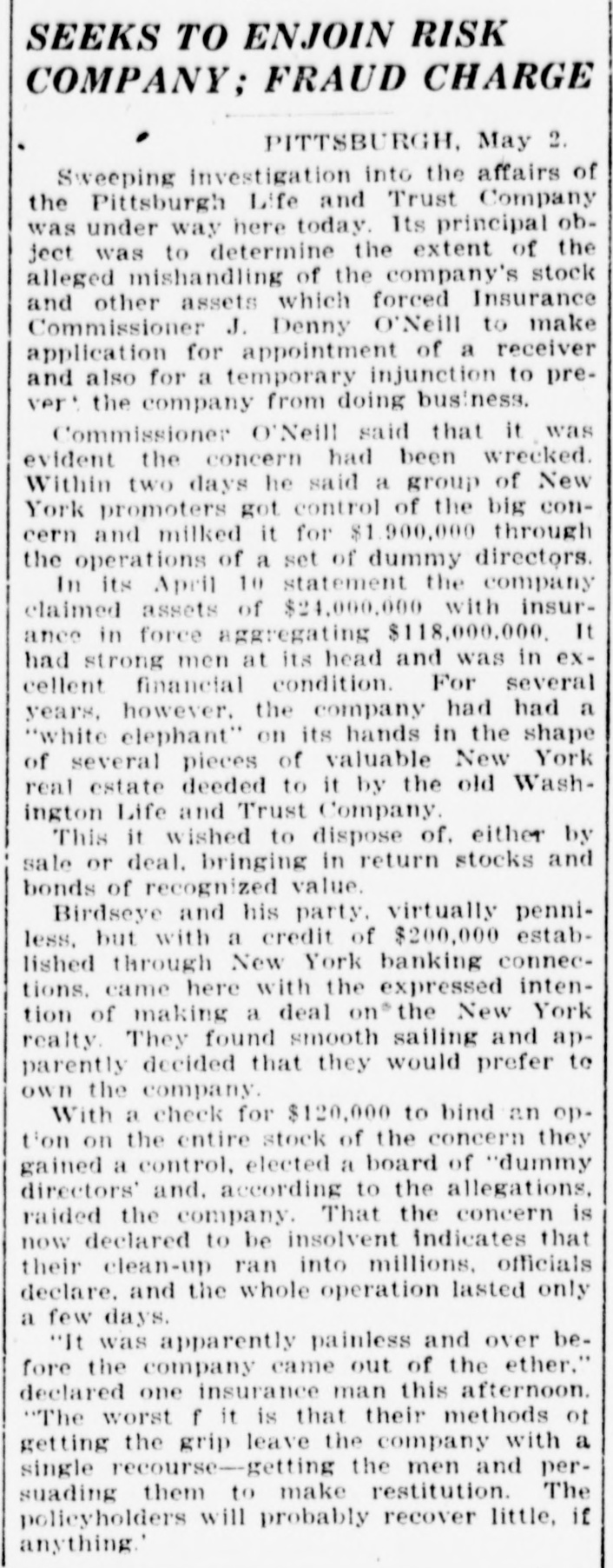 SEEKS TO ENJOIN RISK COMPANY; FRAUD CHARGE PITTSBURGH, May 2. Sweeping investigation into the affairs of the Pittsburgh Life and Trust Company was under way here today. Its principal object was to determine the extent of the alleged mishandling of the company's stock and other assets which forced Insurance Commissioner J. Denny O'Neill to make application for appointment of a receiver and also for a temporary injunction to prever: the company from doing business. Commissioner O'Neill said that it was evident the concern had been wrecked. Within two days he said a group of New York promoters got control of the big concern and milked it for $1,900,000 through the operations of a set of dummy directors. In its April 10 statement the company claimed assets of $24,000.000 with insurance in force aggregating $118,000,000. It had strong men at its head and was in excellent financial condition. For several years, however. the company had had a "white elephant" on its hands in the shape of several pieces of valuable New York real estate deeded to it by the old Washington Life and Trust Company. This it wished to dispose of. either by sale or deal. bringing in return stocks and bonds of recognized value. Birdseye and his party. virtually penniless, but with a credit of $200,000 established through New York banking connections. came here with the expressed intention of making a deal on the New York realty. They found smooth sailing and apparently decided that they would prefer to own the company. With a check for $120,000 to bind an opt'on on the entire stock of the concern they gained a control, elected a board of "dummy directors' and. according to the allegations, raided the company. That the concern is now declared to be insolvent indicates that their clean-up ran into millions. officials declare. and the whole operation lasted only a few days. "It was apparently painless and over before the company came out of the ether." declared one insurance man this afternoon. "The worst f it is that their methods of getting the grip leave the company with a single recourse-getting the men and persuading them to make restitution. The policyholders will probably recover little, if anything.'