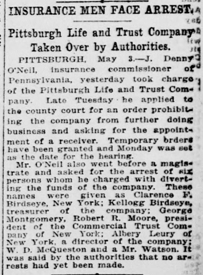 INSURANCE MEN FACE ARREST. Pittsburgh Life and Trust Company Taken Over by Authorities. PITTSBURGH, May 3.-J. Denny O'Neil, insurance commissioner of Pennsylvania, yesterday took charge of the Pittsburgh Life and Trust Company. Late Tuesday he applied to the county court for an order prohibit= ing the company from further doing business and asking for the appointment of a receiver. Temporary brders have been granted and Monday was set as the date for the hearing. Mr. O'Neil also went before a magistrate and asked for the arrest of six persons whom he charged with diverting the funds of the company. These names were given as Clarence F. Birdseye, New York; Kellogg Birdseye, treasurer of the company; George Montgomery, Robert R. Moore, president of the Commercial Trust Company of New York: Albery Leury of New York, a director of the company; W. D. McQueston and a Mr. Watson. It was said by the authorities that no arrests had yet been made.