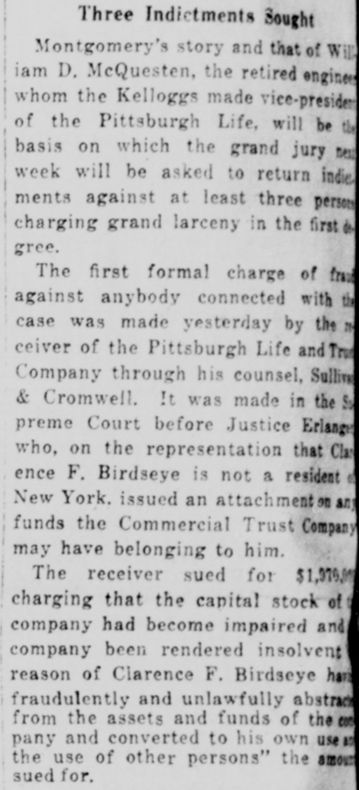Three Indictments Sought Montgomery's story and that of Will iam D. McQuesten, the retired engineer whom the Kelloggs made vice-presiden of the Pittsburgh Life, will be the basis on which the grand jury next week will be asked to return india. ments against at least three persons charging grand larceny in the first der gree. The first formal charge of frau against anybody connected with the case was made yesterday by the N ceiver of the Pittsburgh Life and Trus Company through his counsel, Sullive & Cromwell. It was made in the Ss, preme Court before Justice Erlanges who, on the representation that Class ence F. Birdseye is not a resident New York. issued an attachment on any funds the Commercial Trust Company may have belonging to him. The receiver sued for $1,970.0 charging that the capital stock of company had become impaired and company been rendered insolvent reason of Clarence F. Birdseye have fraudulently and unlawfully abstracte from the assets and funds of the con pany and converted to his own use as the use of other persons" the amount sued for.