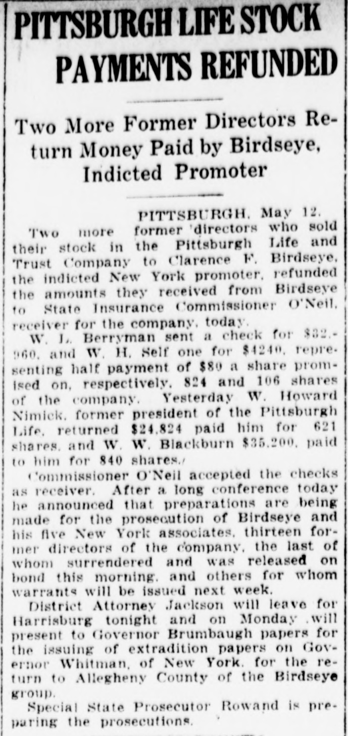 PITTSBURGH LIFE STOCK PAYMENTS REFUNDED Two More Former Directors Return Money Paid by Birdseye, Indicted Promoter PITTSBURGH. May 12. Two more former 'directors who sold their stock in the Pittsburgh Life and Trust Company to Clarence F. Birdseye, the indicted New York promoter. refunded the amounts they received from Birdseye to State Insurance Commissioner O'Neil. receiver for the company. today. W. 1, Berryman sent a check for $32.960. and W. H. Self one for $4240. representing half payment of $80 a share promised on, respectively. 824 and 106 shares of the company. Yesterday W. Howard Nimick. former president of the Pittsburgh Life. returned $24,824 paid him for 621 shares. and W. W. Blackburn $35,200. paid to him for 840 shares./ Commissioner O'Neil accepted the checks as receiver. After a long conference today he announced that preparations are being made for the prosecution of Birdseye and his five New York associates. thirteen former directors of the company, the last of whom surrendered and was released on bond this morning. and others for whom warrants will be issued next week. District Attorney Jackson will leave for Harrisburg tonight and on Monday will present to Governor Brumbaugh papers for the issuing of extradition papers on Governor Whitman, of New York. for the return to Allegheny County of the Birdseye group. Special State Prosecutor Rowand is preparing the prosecutions.