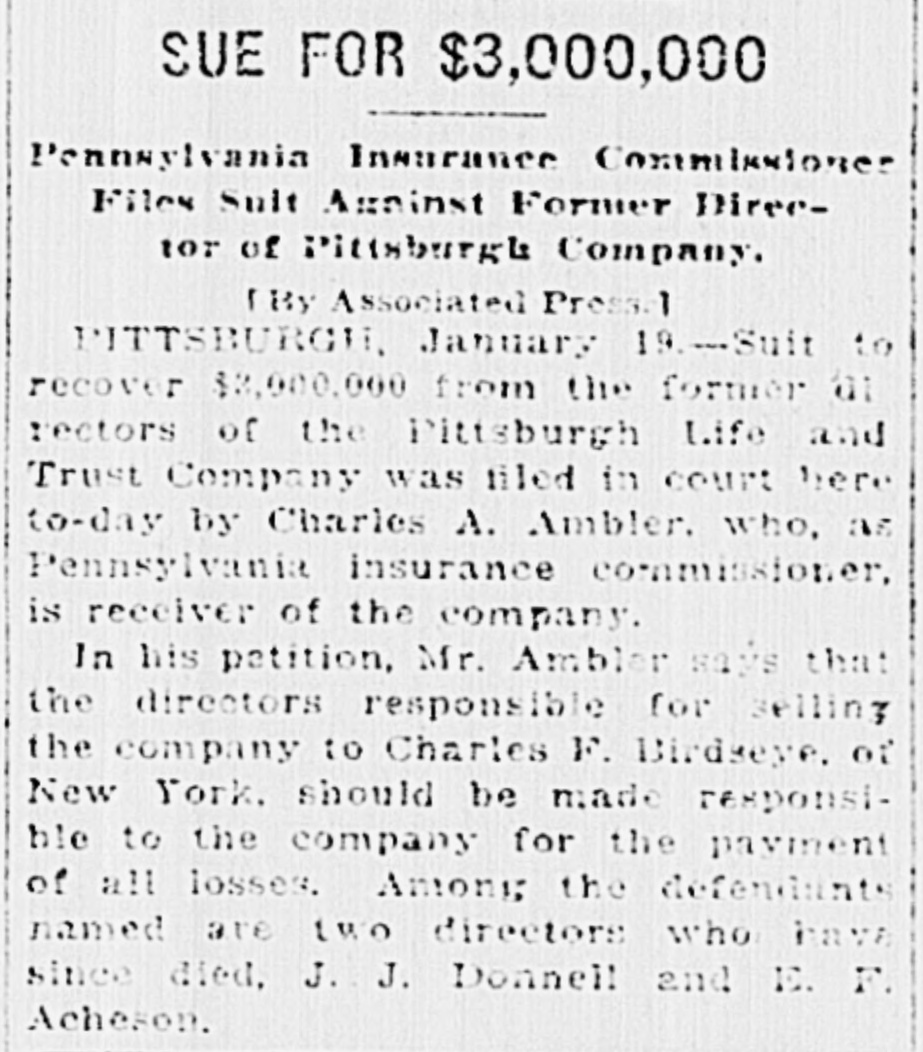 SUE FOR $3,000,000 Pennsylvania Insurance Commissioner Files Sult Against Former Direcfor of Pittsburgh Company. TBy Associated Pressel PITTSBURGH, January 19.-Suit to recover $3,000.000 from the former at rectors of the Pittsburgh Life and Trust Company was filed in court here to-day by Charles A. Ambler. who, as Pennsylvania insurance commissioner, is receiver of the company. In his patition, Mr. Ambler says that the directors responsible for selling the company to Charles F. Birdseye. of New York. should be made responsible to the company for the payment of all losses. Among the defendunts named are two directors who have since died, J. J. Donnell and E. F. Acheson.