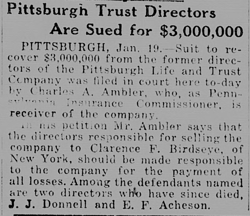 Pittsburgh Trust Directors Are Sued for $3,000,000 PITTSBURGH, Jan. 19.-Suit to recover $3,000,000 from the former directors of the Pittsburgh Life and Trust Company was filed in court here to-day by Charles A. Ambler, who, as Pennsylvania Insurance Commissioner, is receiver of the company. in nis petition Mr. Ambler says that the directors responsible for selling the company to Clarence F. Birdseye, of New York, should be made responsible to the company for the payment of all losses. Among the defendants named are two directors who have since died, J. J. Donnell and E. F. Acheson.