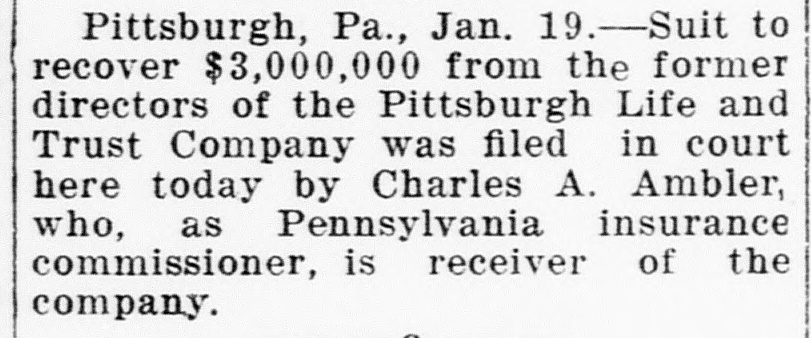 Insurance Commissioner Ambler has brought suit for $3,000,000 against the former directors of the old Pittsburgh Life and Trust Company. The action grows out of the receivership and hits some prominent men.