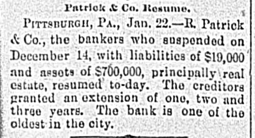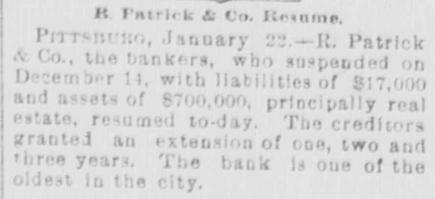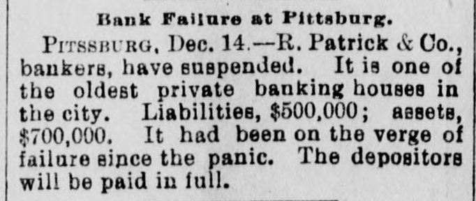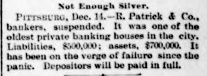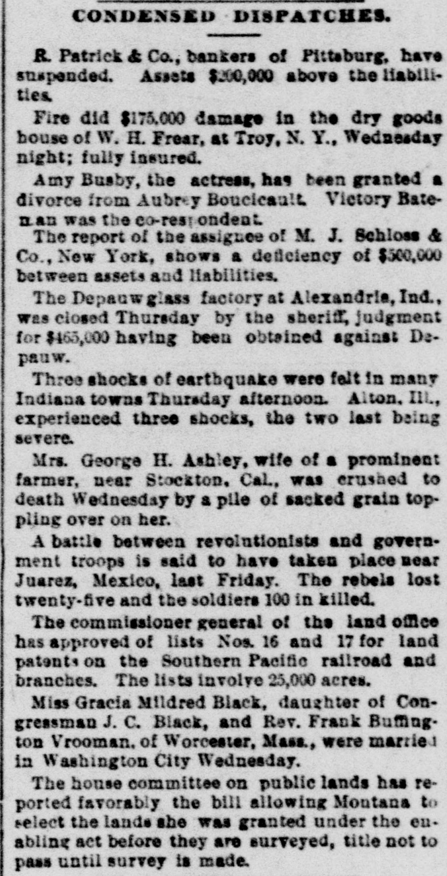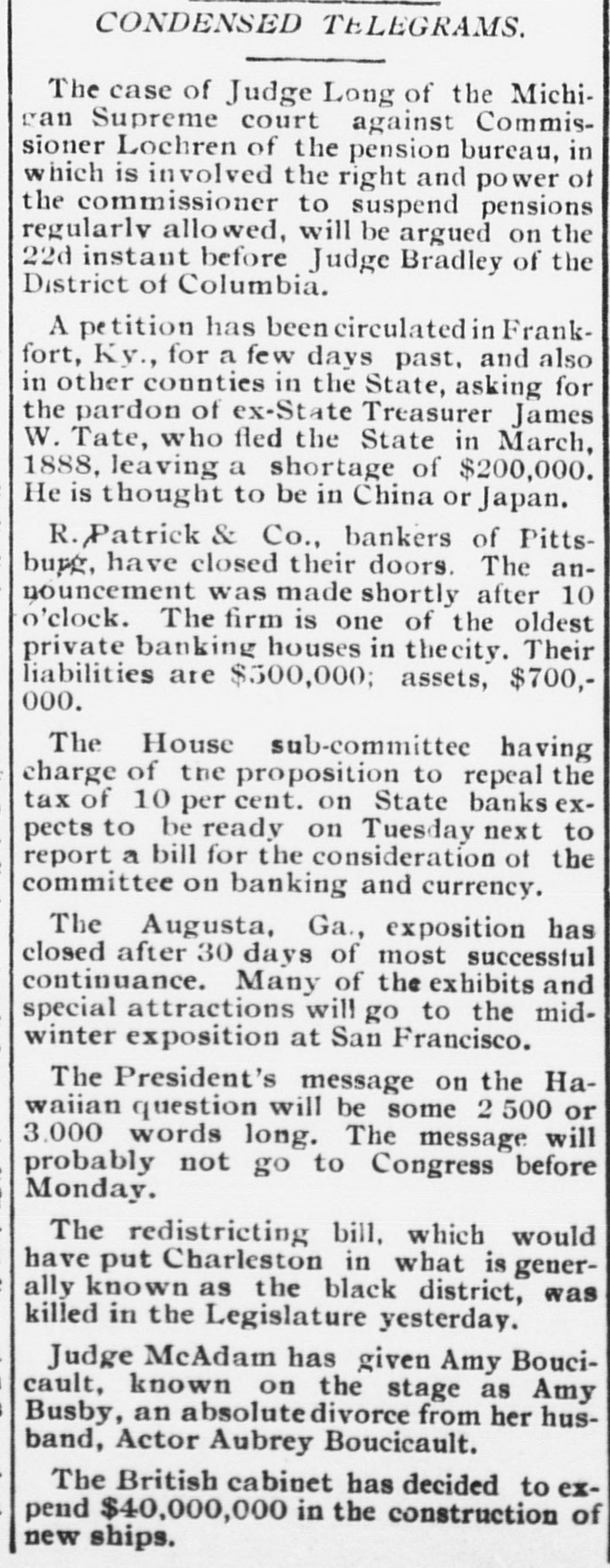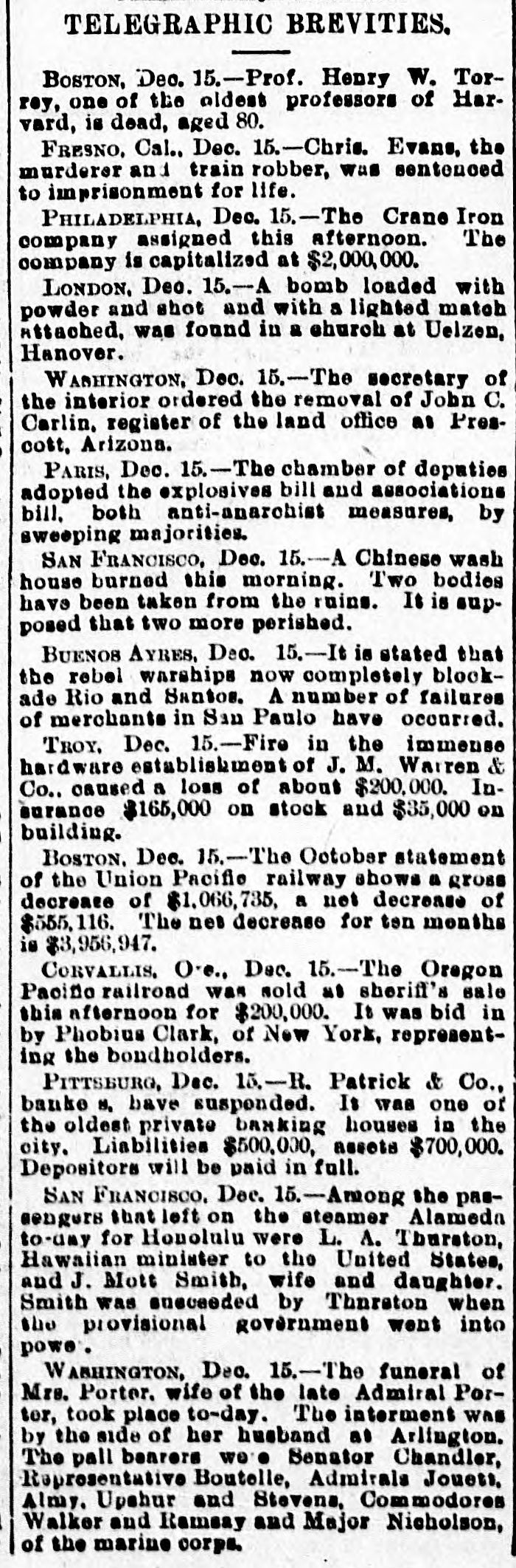 TELEGRAPHIC BREVITIES. BOSTON, Dec. 15.-Prof. Henry W. Torrey, one of the oldest professors of Harvard, is dead, aged 80. FRESNO, Cal.. Dec. 15.-Chris. Evans, the murderer and train robber, was senteuced to imprisonment for life. PHILADELPHIA, Dec. 15.-The Crane Iron company assigned this afternoon. The company is capitalized at $2,000,000. LONDON. Deo. 15.-A bomb loaded with powder and shot and with a lighted match Attached, was found in a church at Uelzen, Hanover. WASHINGTON, Dec. 15.-The secretary of the interior ordered the removal of John C. Carlin. register of the land office as Prescott. Arizona. PARIS, Dec. 15.-The - chamber of depatiee adopted the explosives bill and associations bill. both anti-anarchist measures, by sweeping majorities. SAN FRANCISCO, Dec. 15.-A Chinese wash house burned this morning. Two bodies have been taken from the ruins. It is supDosed that two more perished. BUENOB AYRES, Deo. 15.-It is stated that the rebel warships now completely blockade Rio and Santos. A number of failures of merchants in San Paulo have occurred. TROY, Dec. 15.-Fire in the immense hardware establishment of J. M. Warren & Co.. caused a loss of about $200,000. Insurance $165,000 on stock and $35,000 on building. BOSTON. Dec. 15.-The October statement of the Union Pacific railway shows n gross decrease of $1,066,735, a net decrease of $555,116. The net decrease for ten months is $3,956,947. CORVALLIS. Oe., Dac. 15.-The Oregon Pacific railroad was sold us sheriff's sale this afternoon for $200,000. It was bid in by Phobius Clark, of New York, representing the bondholders. PITTSBURG, Dec. 15.-R. Patrick & Co., banko M. have susponded. It was one of the oldest private banking houses in the city. Liabilities $500,000, assets $700,000. Depositors will be paid in full. SAN FRANCISCO. Dec. 15.-Among the pasaengers that left on the steamer Alameda to-day for Honolulu were L. A. Tburston, Hawaiian minister to the United States, and J. Mott Smith, wife and daughter. Smith was susceeded by Thurston when the provisional government went into powe. WASHINGTON, Dec. 15.-The funeral of Mrs. Porter. wife of the late Admiral Porter, took place to-day. The interment was by the side of her husband as Arlington. The pall bearers we'e Senator Chandler, Representative Boutelle, Admirals Jouets, Almy. Upehur and Stevens. Commodores Walker and Ramsay and Major Nicholson, of the marine corps.