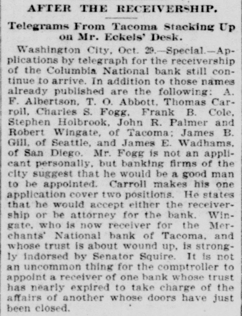 It was the approach of the close of this year of grace, together with the appointment of a new finance committee that brought suddenly to a close the career of the Bank of Tacoma, with some $228,000 of city money ostensibly on deposit there. An assignment was made to a friend of the president, but the court appointed Tilton receiver. The books were stolen before the receiver could get possession, but enough was left behind to show that Boggs had been borrower to the extent of over $50,000 that he had overdrawn; that he had had $18,000 for "election expenses"; that Wheeler was sent remittances monthly of hundreds of dollars and that Boggs' deposits had consisted of cash, notes, warrants or "any old thing."