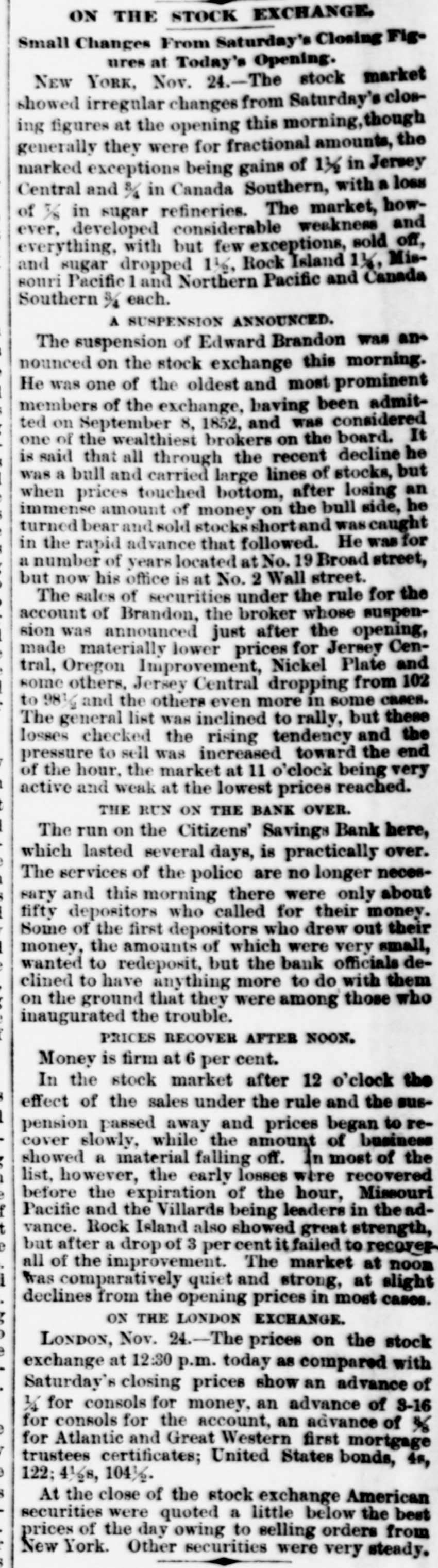 EXCHANGE ON Small Changes From Saturday's Closing Figures at Today's Opening. NEW YORK, Nov. 24.-The stock market showed irregular changes from Saturday's closing figures at the opening this morning, though generally they were for fractional amounts, the marked exceptions being gains of 1% in Jersey Central and s/4 in Canada Southern, with a loss of % in sugar refineries. The market, however, developed considerable weakness and everything, with but few exceptions, sold off, and sugar dropped 1% Rock Island 14, Missouri Pacific 1 and Northern Pacific and Canada Southern 5/4 each. A SUSPENSION ANNOUNCED. The suspension of Edward Brandon was announced on the stock exchange this morning. He was one of the oldest and most prominent members of the exchange, having been admitted on September 8, 1852, and was considered one of the wealthiest brokers on the board. It is said that all through the recent decline he was a bull and carried large lines of stocks, but when prices touched bottom, after losing an immense amount of money on the bull side, he turned bear and sold stocks short and was caught in the rapid advance that followed. He was for number of years located at No. 19 Broad street, but now his office is at No. 2 Wall street. The sales of securities under the rule for the account of Brandon, the broker whose suspension was announced just after the opening, made materially lower prices for Jersey Central, Oregon Improvement, Nickel Plate and some others, Jersey Central dropping from 102 to 981/2 and the others even more in some cases. The general list was inclined to rally, but these losses checked the rising tendency and the pressure to sell was increased toward the end of the hour. the market at 11 o'clock being very active and weak at the lowest prices reached. THE RUN ON THE BANK OVER. The run on the Citizens' Savings Bank here, which lasted several days, is practically over. The services of the police are no longer neceseary and this morning there were only about fifty depositors who called for their money. Some of the first depositors who drew out their money, the amounts of which were very small, wanted to redeposit, but the bank officials declined to have anything more to do with them on the ground that they were among those who inaugurated the trouble. PRICES RECOVER AFTER NOON. Money is firm at 6 per cent. In the stock market after 12 o'clock the effect of the sales under the rule and the suspension passed away and prices began to recover slowly, while the amount of business showed a material falling off. In most of the list, however, the early losses were recovered before the expiration of the hour, Missouri Pacific and the Villards being leaders in the advance. Rock Island also showed great strength, but after a drop of 3 per cent it failed to recover all of the improvement. The market at noon was comparatively quiet and strong, at slight declines from the opening prices in most cases. ON THE LONDON EXCHANGE. LONDON, Nov. 24.-The prices on the stock exchange at 12:30 p.m. today as compared with Saturday's closing prices show an advance of 3/4 for consols for money, an advance of 3-16 for consols for the account, an advance of % for Atlantic and Great Western first mortgage trustees certificates; United States bonds, 4s, 122:41/8, 104% At the close of the stock exchange American securities were quoted a little below the best prices of the day owing to selling orders from New York. Other securities were very steady.