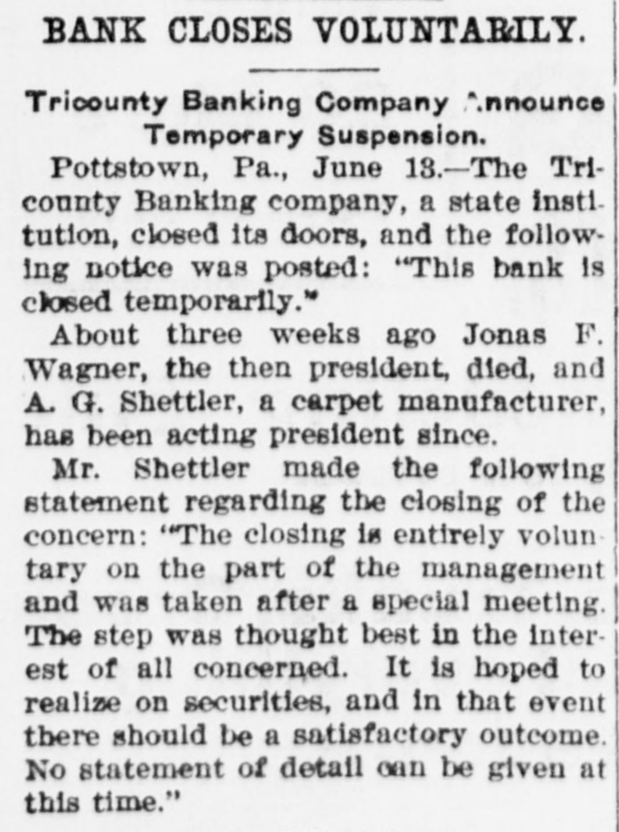 BANK CLOSES VOLUNTARILY. Tricounty Banking Company ^nnounce Temporary Suspension. Pottstown, Pa., June 13.-The Tricounty Banking company, a state institution, closed its doors, and the following notice was posted: "This bank is closed temporarily." About three weeks ago Jonas F. Wagner, the then president, died, and A. G. Shettler, a carpet manufacturer, has been acting president since. Mr. Shettler made the following statement regarding the closing of the concern: "The closing is entirely voluntary on the part of the management and was taken after a special meeting. The step was thought best in the interest of all concerned. It is hoped to realize on securities, and in that event there should be a satisfactory outcome. No statement of detail can be given at this time."