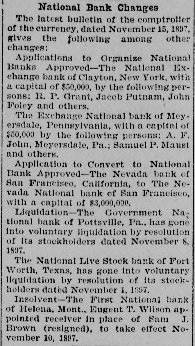 National Bank Changes The latest bulletin of the comptroller of the currency, dated November 15, 1897, gives the following among other changes: Applications to Organize National Banks Approved-The National Exchange bank of Clayton, New York, with a capital of $50,000, by the following persons: R. P. Grant, Jacob Putnam, John Foley and others. The Exchange National bank of Meyersdale, Pennsylvania, with a capital of $50,000 by the following persons: A. F. John, Meyersdale, Pa.; Samuel P. Maust and others. Application to Convert to National Bank Approved-The Nevada bank of San Francisco, California, to The Nevada National bank of San Francisco, with a capital of $3,000,000. Liquidation-The Government National bank of Pottsville, Pa., has gone into voluntary liquidation by resolution of its stockholders dated November 8, 1897. The National Live Stock bank of Fort Worth, Texas, has gone into voluntary liquidation by resolution of its stockholders dated November 1, 1897. Insolvent-The First National bank of Helena, Mont., Eugent T. Wilson appointed receiver in place of Sam J. Brown (resigned), to take effect November 10, 1897.