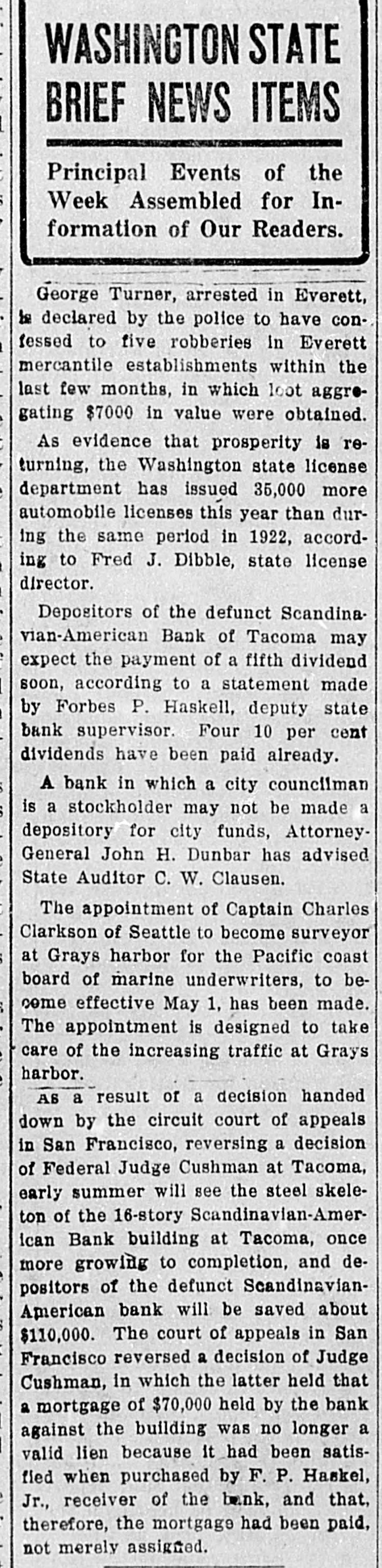 WASHINGTON STATE BRIEF NEWS ITEMS Principal Events of the Week Assembled for Information of Our Readers. George Turner, arrested in Everett, be declared by the police to have confessed to five robberies in Everett mercantile establishments within the last few months, in which loot aggres gating $7000 in value were obtained. As evidence that prosperity is returning, the Washington state license department has issued 35,000 more automobile licenses this year than during the same period in 1922, according to Fred J. Dibble, state license director. Depositors of the defunct Scandinavian-American Bank of Tacoma may expect the payment of a fifth dividend soon, according to a statement made by Forbes P. Haskell, deputy state bank supervisor. Four 10 per cent dividends have been paid already. A bank in which a city councilman is a stockholder may not be made a depository for city funds, AttorneyGeneral John H. Dunbar has advised State Auditor C. W. Clausen. The appointment of Captain Charles Clarkson of Seattle to become surveyor at Grays harbor for the Pacific coast board of marine underwriters, to become effective May 1, has been made. The appointment is designed to take care of the increasing traffic at Grays harbor. AS a result of a decision handed down by the circuit court of appeals in San Francisco, reversing a decision of Federal Judge Cushman at Tacoma, early summer will see the steel skeleton of the 16-story Scandinavian-Amer ican Bank building at Tacoma, once more growing to completion, and depositors of the defunct ScandinavianAmerican bank will be saved about $110,000. The court of appeals in San Francisco reversed a decision of Judge Cushman, in which the latter held that a mortgage of $70,000 held by the bank against the building was no longer a valid lien because It had been satisfied when purchased by F. P. Haskel, Jr., receiver of the bank, and that, therefore, the mortgage had been paid, not merely assigned.