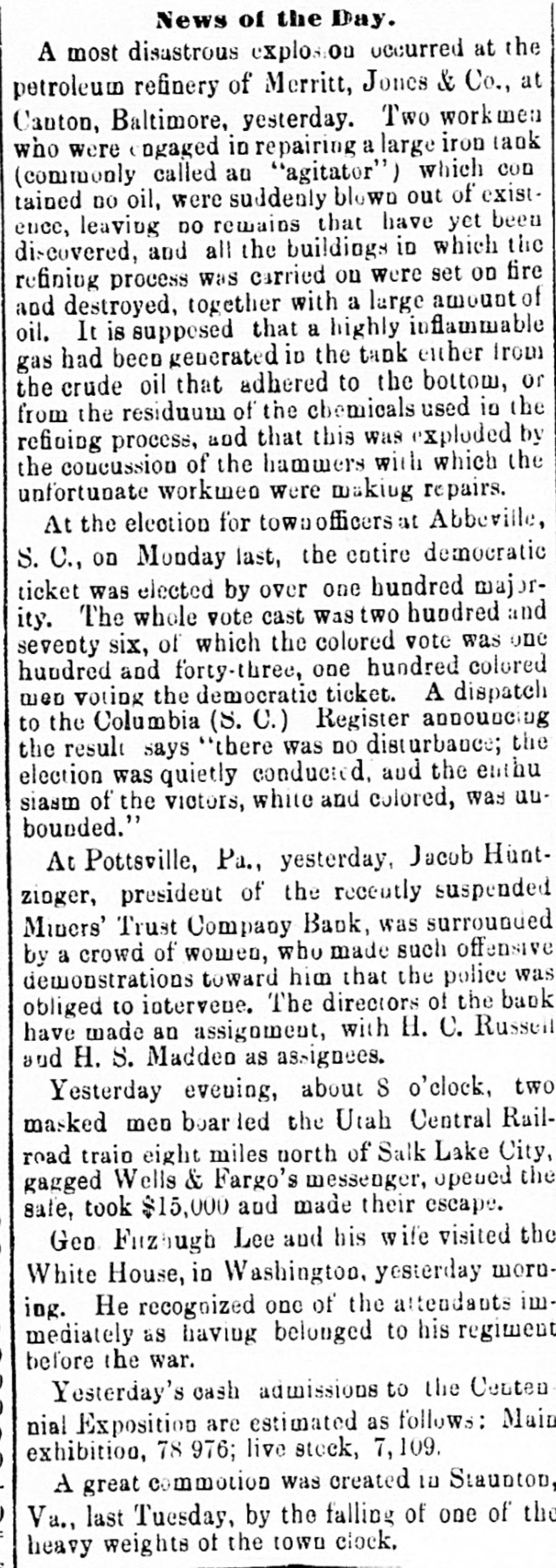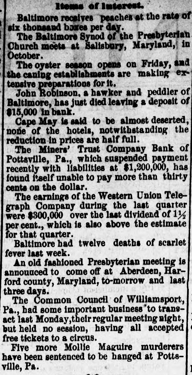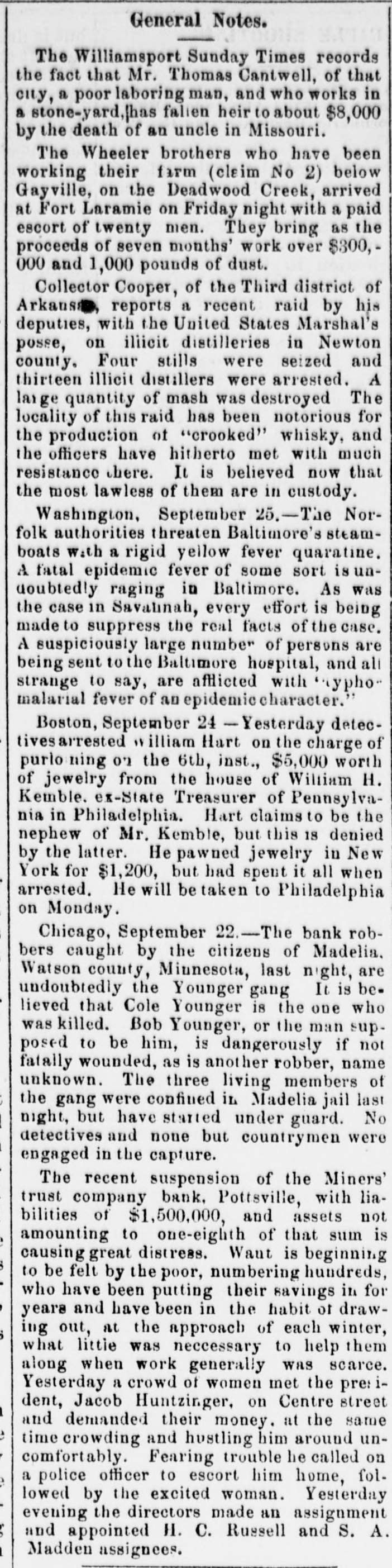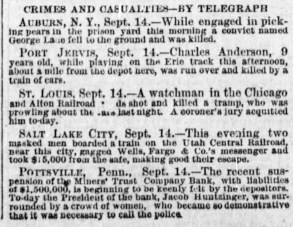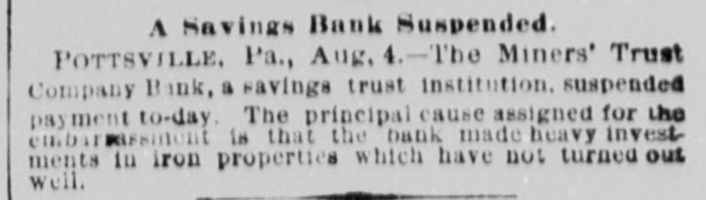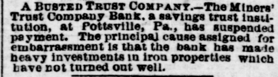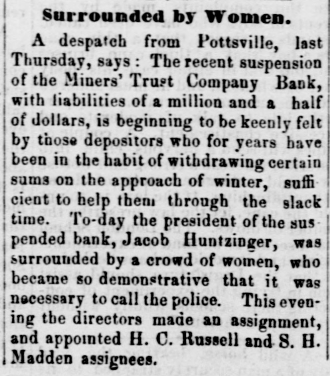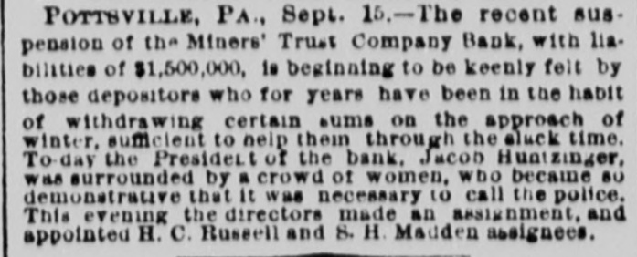 All the business failures, the destruction of property by fire and flood and storm during the past sixty-five years, since Schuykill county was formed, have not brought as much ruin, distress, grief, sleeplessness, shedding of tears, starvation, want and misery on our people as the failure of the Miners' Trust Company Bank of Pottsville, through the gross mismanagement, criminal misappropriation and corrupt practices of its designing president, Jacob Huntzinger-Pottsville Evening Chronicle.
