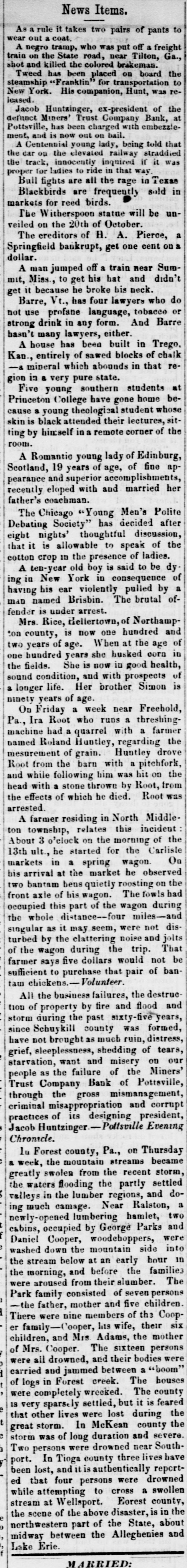 In Forest county, Pa., on Thursday a week, the mountain streams became greatly swollen from the recent storm, the waters flooding the partly settled valleys in the lumber regions, and doing much damage. Near Ralston, a newly-opened lumbering hamlet, two cabins, occupied by George Parks and Daniel Cooper, woodchoppers, were washed down the mountain side into the stream below at an early hour in the morning, and before the families were aroused from their slumber. The Park family consisted of seven persons - the father, mother and five children. There were nine members of the Cooper family-Cooper, his wife, their six children, and Mrs. Adams, the mother of Mrs. Cooper. The sixteen persons were all drowned, and their bodies were carried and jammed between a "boom" of logs in Forest creek. The houses were completely wrecked. The county is very sparsely settled, but it is feared that other lives were lost during the great storm. In McKean county the storm was of long duration and severe.