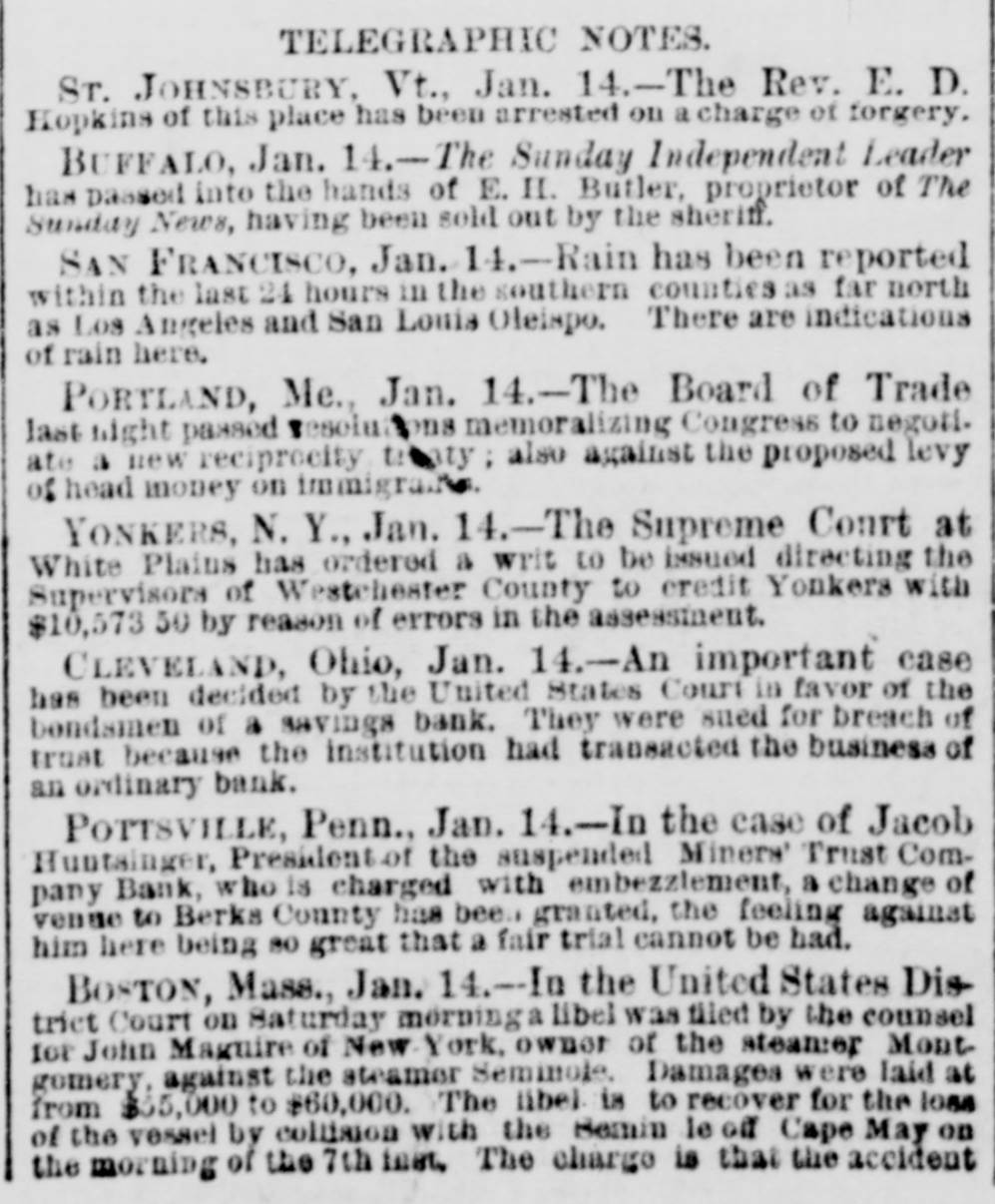 Jacob Huntzinger, ex-president of the defunct Miners' Trust Company Bank, at Pottsville, has been charged with embezzlement, and is now out on bail.