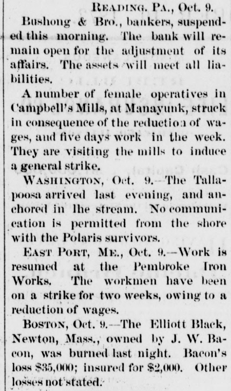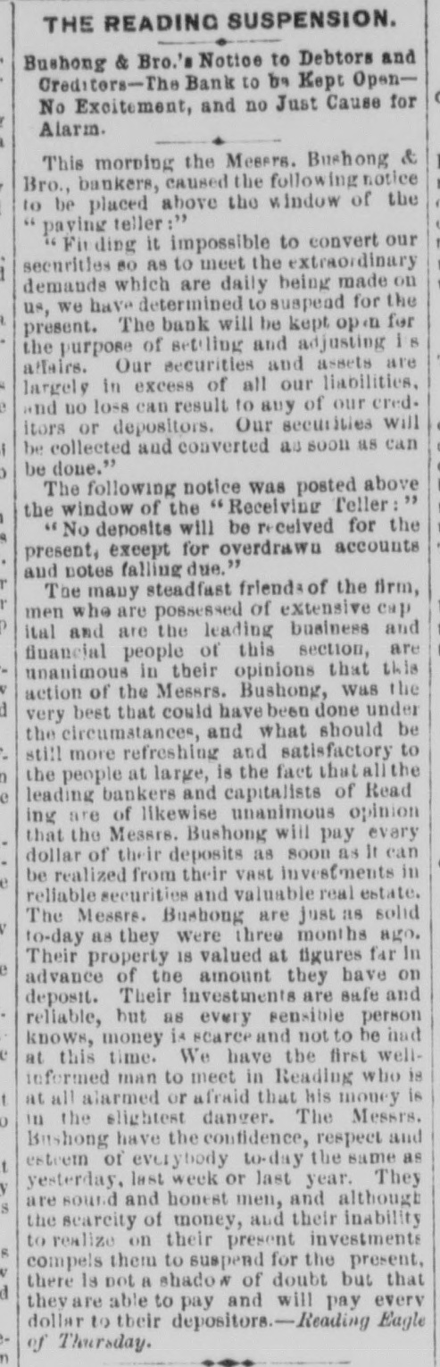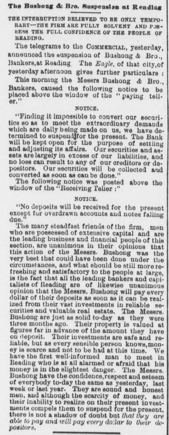 The Bushong & Bro. Suspension at Reading THE INTERRUPTION BELIEVED TO BE ONLY TEMPOHARY-- THE FIRM ARE FULLY BOLVENT AND POBSESS THE FULL CONFIDENCE OF THE PEOPLE OF READING. The telegrams to the COMMERCIAL, yesterday, announced the suspension of Bushong & Bro., Bankers,at Reading The Eagle, of that city,of yesterday afternoon gives further particulars This morning the Messrs Bushong & Bro., Bankers, caused the following notice to be placed above the window of the "paying teller." NOTICE. "Finding it impossible to convert our securitics 80 as to meet the extraordinary demands which are daily being made on us, we have determined to suspendifor the present. The Bank will be kept open for the purpose of settling and adjusting its affairs. Our securities and assets are largely in excess of our liabilities, and no loss can result to any of our creditors or depositors. Our securities will be collected and converted as soon as can be done." The following notice was posted above the window of the "Receiving Telier :" NOTICE. "No depoeits will be received for the present except for overdrawn accounts and notes falling due." The many steadfast friends of the firm, men who are possessed of extensive capital and are the leading business and financial people of this section. are unanimous in their opinions that this action of the Messrs. Bushong was the very best that could have been done under the circumstances, and what should be still morerefreshing and satisfactory to the people at large, is the fact that all the leading bankers and capitalists of Reading are of likewise unanimous opinion that the Messrs. Bushong will pay every dollar of their deposits as soon as it can be realized from their vast investments in reliable securities and valuable real estate. The Messrs. Bushong are just as solid to-day as they were three months ago. Their property is valued at figures far in advance of the amount they have on deposit. Their investments are safe and reliable, but as every sensible person knows, money is scarce and not to be had at this time. We have the first well-informed man to meet in Reading who is at all alarmed or afraid that his money is in the slightest danger. The Messrs. Bushong have the confidence, respect and esteem of everybody to-day the same as yesterday, last week or last year. They are sound and honest men, and although the scarcity of money, and their inability to realize on their present investments compels them to suspend for the present, there is not a shadow of doubt but that they are able to pay and will pay every dollar to their depositors.