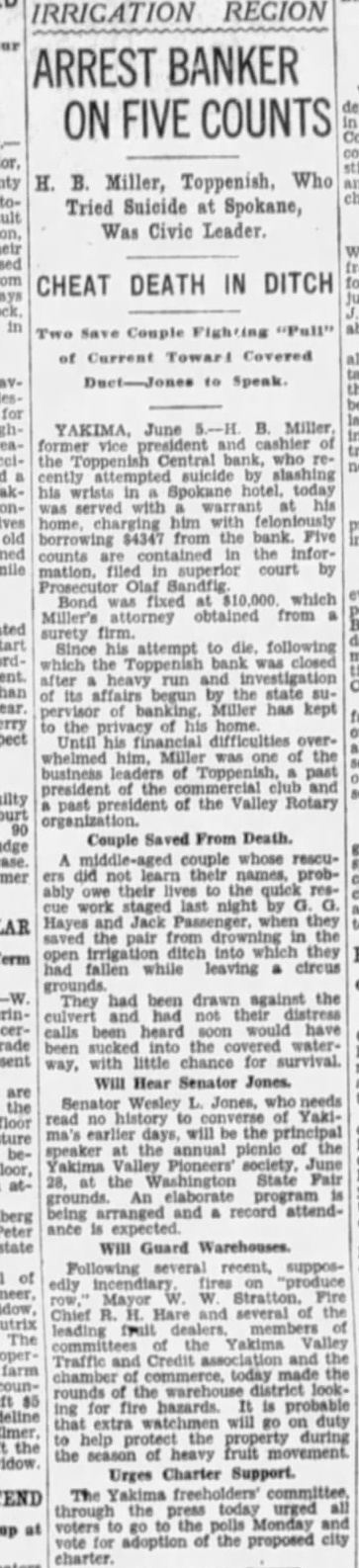 RUN MADE ON BANK April the Central Bank of Toppenish today brought heavy withdrawals and President Gilbert, announced tonight the institution would placed in the hands of the state bank supervisor tomorrow Gilbert attributed the to "hysteria" which he said followed the attempted suicide by Miller, Spokane last Friday night. Miller covering.
