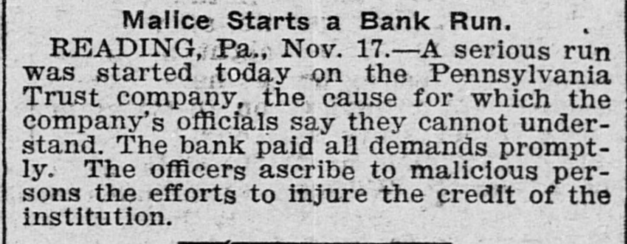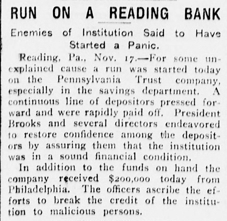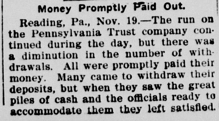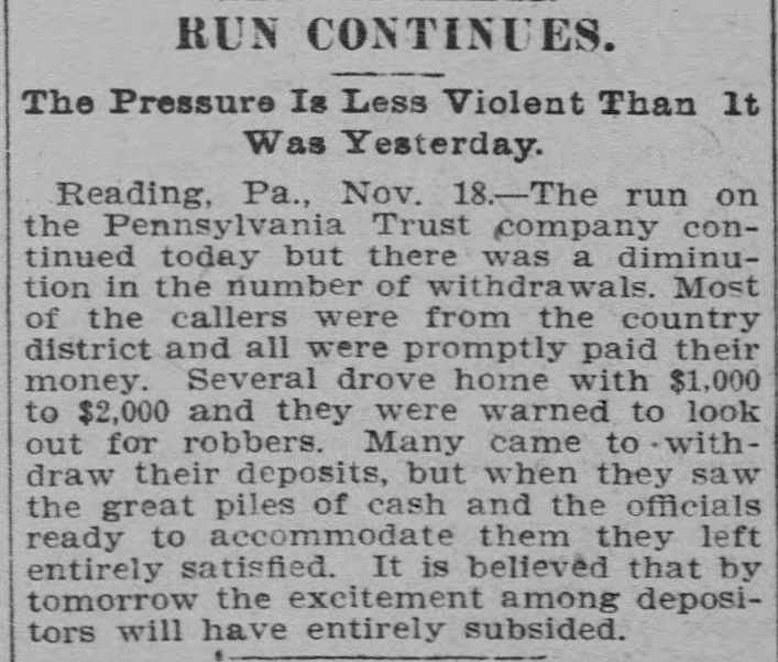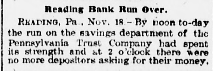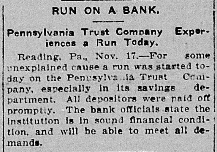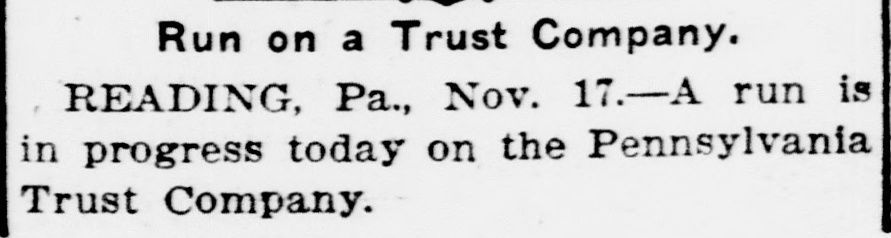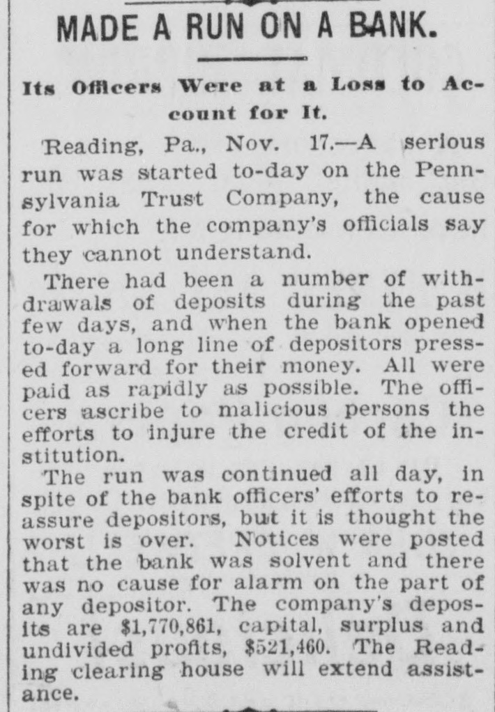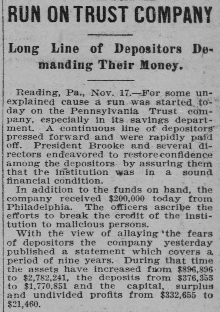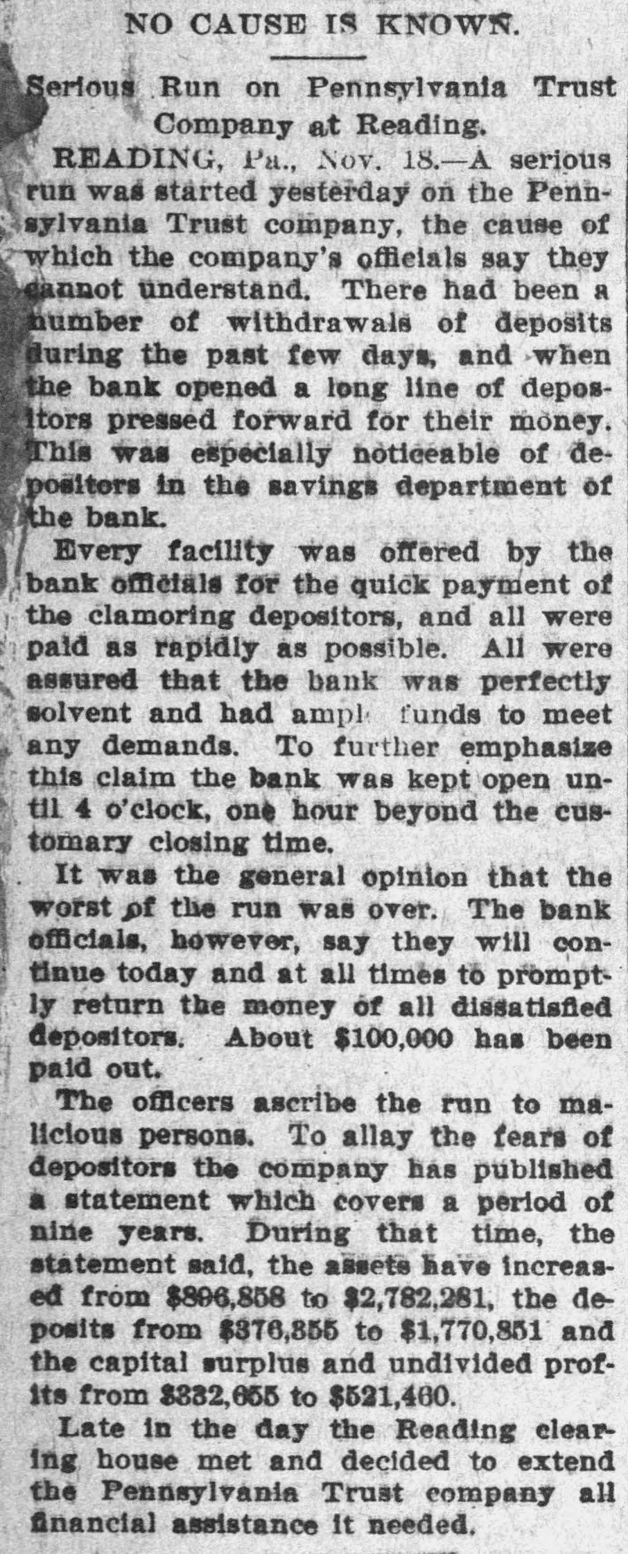 RUN ON TRUST COMPANY Long Line of Depositors Demanding Their Money. Reading, Pa., Nov. 17.-For some unexplained cause a run was started today on the Pennsylvania Trust company, especially in its savings department. A continuous line of depositors pressed forward and were rapidly paid off. President Brooke and several directors endeavored to restoreconfidence among the depositors by assuring them that the institution was in a sound financial condition. In addition to the funds on hand, the company received $200,000 today from Philadelphia. The officers ascribe the efforts to break the credit of the institution to malicious persons. With the view of allaying 'the fears of depositors the company yesterday published a statement which covers a period of nine years. During that time the assets have increased from $896,896 to $2,782,241, the deposits from $376,355 to $1,770,851 and the capital, surplus and undivided profits from $332,655 to $21,460.