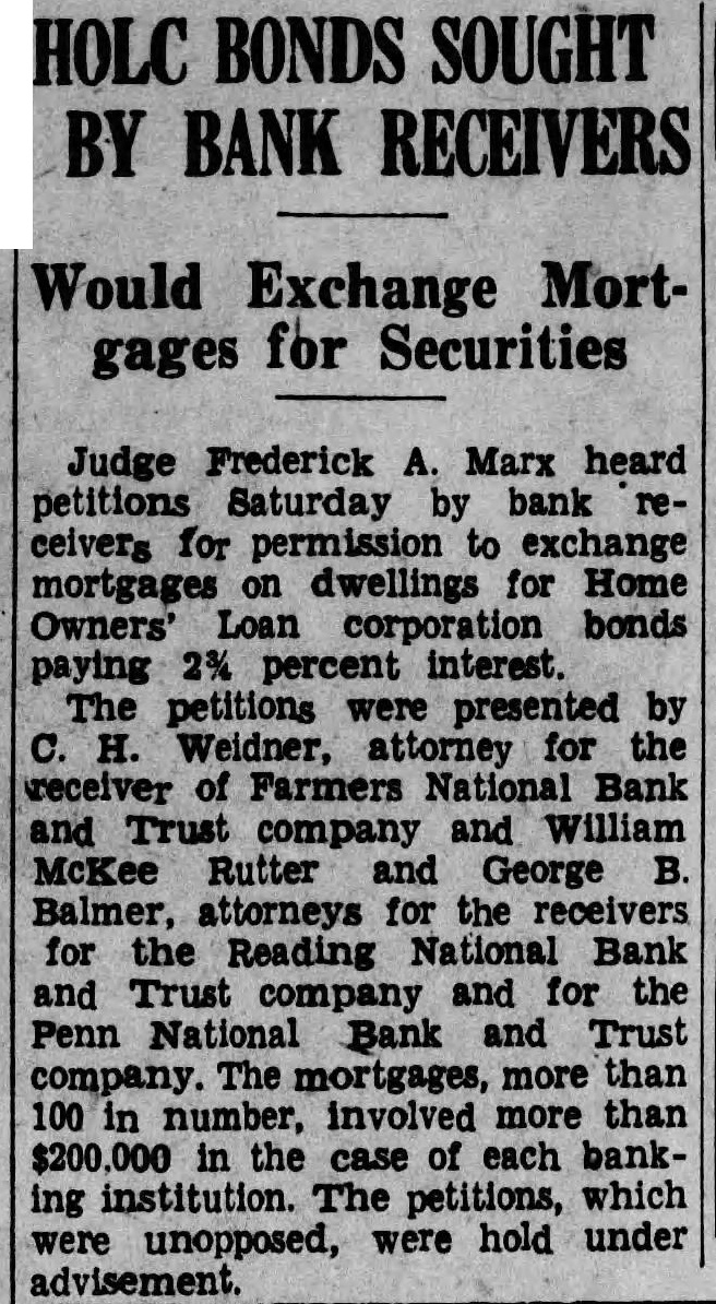 HOLC BONDS SOUGHT BY BANK RECEIVERS Would Exchange Mortgages for Securities Judge Frederick A. Marx heard petitions Saturday by bank receivers for permission to exchange mortgages on dwellings for Home Owners Loan corporation bonds paying 2% percent interest. The petitions were presented by C. Weidner, attorney for the receiver of Farmers National Bank and Trust company and William McKee Rutter and George B Balmer, attorneys for the receivers for the Reading National Bank and Trust company and for the Penn National Bank and Trust company. The mortgages, more than 100 in number, involved more than $200.000 in the case of each banking institution. The petitions, which were unopposed, were hold under