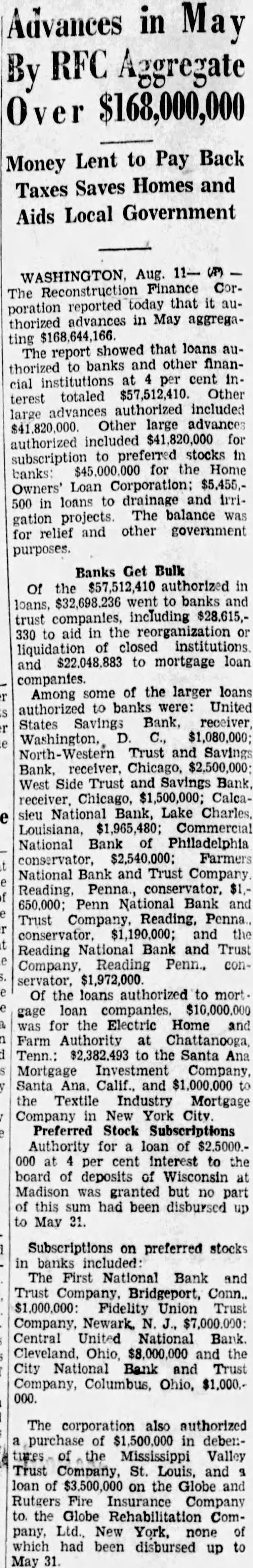 Advances in May By RFC Aggregate Over $168,000,000 Money Lent to Pay Back Taxes Saves Homes and Aids Local Government The Reconstruction Finance Corporation reported today that it authorized advances in May aggregating $168,644,166 The report showed that loans authorized to banks and other financial institutions at 4 per cent interest totaled $57,512,410. Other large advances authorized included $41,820,000. Other large advances authorized included $41,820,000 for subscription to preferred stocks in banks $45,000,000 for the Home Owners' Loan Corporation: $5,455.500 in loans to drainage and irrigation projects. The balance was for relief and other government purposes. Banks Get Bulk Of the $57,512,410 authorized in loans, $32,698,236 went to banks and trust companies, including $28.615,330 to aid in the reorganization or liquidation of closed institutions and $22,048.883 to mortgage loan companies. Among some of the larger loans authorized to banks were: United States Savings Bank, receiver Washington, D. C., $1,080,000; North-Western Trust and Savings Bank, receiver, Chicago, $2,500,000 West Side Trust and Savings Bank, receiver. Chicago, $1,500,000; Calcasieu National Bank, Lake Charles, Louisiana, $1,965,480; Commercial National Bank of Philadelphia conservator, $2,540,000; Farmers National Bank and Trust Company 650,000; Penn National Bank and Trust Company, Reading, Penna. conservator, $1,190,000; and the Reading National Bank and Trust Company, Reading Penn., conservator, $1,972,000 Of the loans authorized to mort gage loan companies. $10,000,000 was for the Electric Home and Farm Authority at Chattanooga Tenn.: $2,382,493 to the Santa Ana Mortgage Investment Company, Santa Ana. Calif., and $1,000,000 to the Textile Industry Mortgage Company in New York City. Preferred Stock Subscriptions Authority for a loan of $2,5000.000 at 4 per cent interest to the board of deposits of Wisconsin at Madison was granted but no part of this sum had been disbursed up to May 31. Subscriptions on preferred stocks in banks included: The First National Bank and Trust Company, Bridgeport, Conn. $1,000,000 Fidelity Union Trust Company, Newark, N. J., $7,000.000 Central United National Bank. Cleveland. Ohio, $8,000,000 and the City National Bank and Trust Company, Columbus, Ohio, $1,000.000. The corporation also authorized a purchase of $1,500,000 in debentures. of the Mississippi Valley Trust Company, St. Louis, and 9 loan of $3,500,000 on the Globe and Rutgers Fire Insurance Company to. the Globe Rehabilitation Company, Ltd. New York, none of which had been disbursed up to May 31.