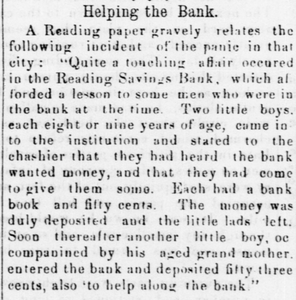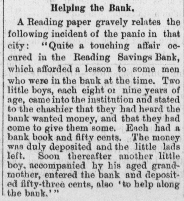 Helping the Bank. A Reading paper gravely relates the following incident of the panic in that city "Quite a touching affair 00cured in the Reading Savings Bank, which afforded a lesson to some men who were in the bank at the time. Two little boys, each eight or nine years of age, came into the institution and stated to the chashier that they had heard the bank wanted money, and that they had come to give them some. Each had a bank book and fifty cents. The money was duly deposited and the little lads left. Soon thereafter another little boy, accompanied hy his aged grandmother, entered the bank and deposited fifty-three cents, also 'to help along the bank.''