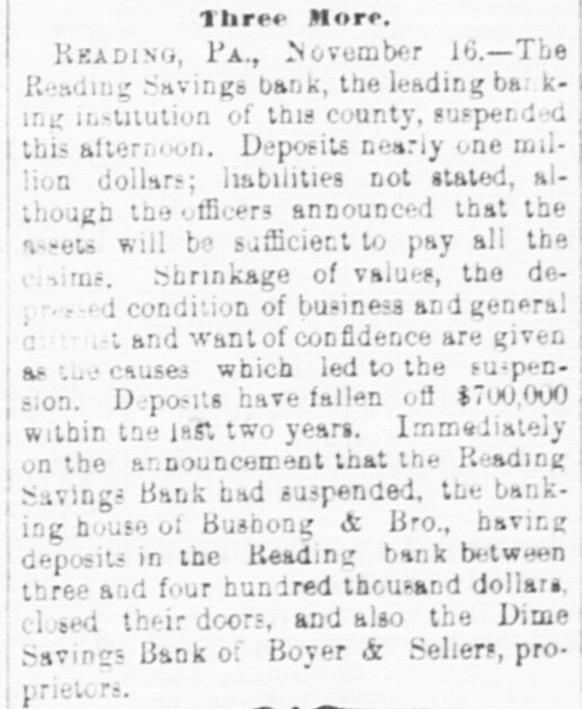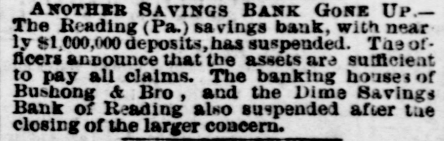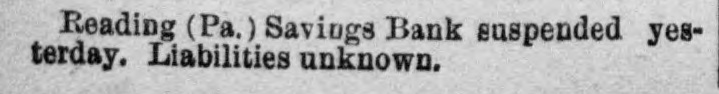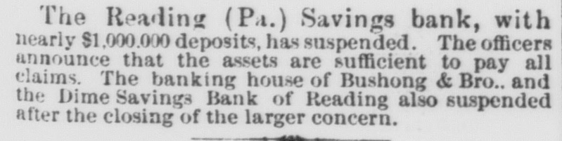 The Reading (Pa.) Savings bank, with nearly $1,000.000 deposits, has suspended. The officers announce that the assets are sufficient to pay all claims. The banking house of Bushong & Bro.. and the Dime Savings Bank of Reading also suspended after the closing of the larger concern.
