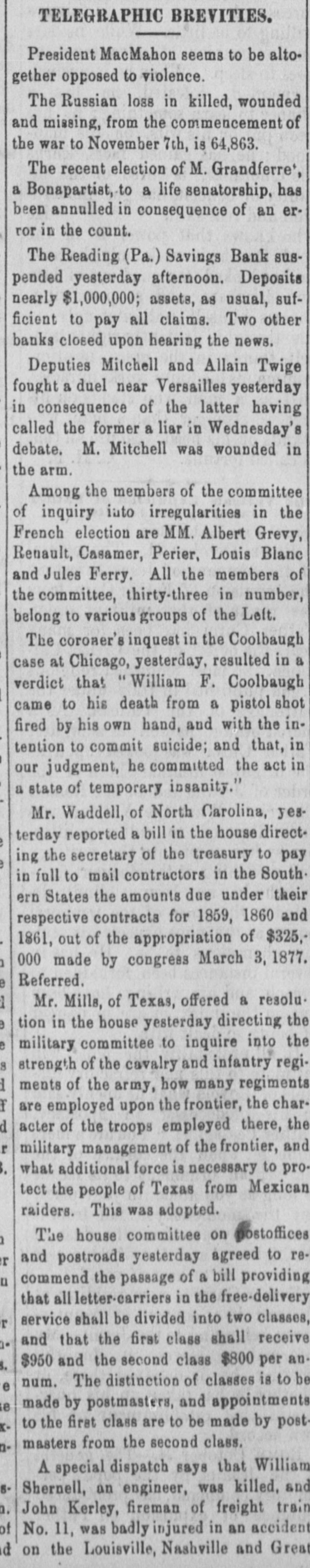 TELEGRAPHIC BREVITIES. President MacMahon seems to be altogether opposed to violence. The Russian loss in killed, wounded and missing, from the commencement of the war to November 7th, is 64,863. The recent election of M. Grandferre', a Bonapartist, to a life senatorship, has been annulled in consequence of an error in the count. The Reading (Pa.) Savings Bank suspended yesterday afternoon. Deposits nearly $1,000,000; assets, as usual, sufficient to pay all claims. Two other banks closed upon hearing the news. Deputies Mitchell and Allain Twige fought a duel near Versailles yesterday in consequence of the latter having called the former a liar in Wednesday's debate. M. Mitchell was wounded in the arm. Among the members of the committee of inquiry into irregularities in the French election are MM. Albert Grevy, Renault, Casamer, Perier, Louis Blanc and Jules Ferry. All the members of the committee, thirty-three in number, belong to various groups of the Left. The coroner's inquest in the Coolbaugh case at Chicago, yesterday, resulted in a verdict that William F. Coolbaugh came to his death from a pistol shot fired by his own hand, and with the intention to commit suicide; and that, in our judgment, he committed the act in a state of temporary insanity." Mr. Waddell, of North Carolina, yesterday reported a bill in the house directing the secretary of the treasury to pay in full to mail contractors in the South. ern States the amounts due under their respective contracts for 1859, 1860 and 1861, out of the appropriation of $325,000 made by congress March 3, 1877. Referred. Mr. Mills, of Texas, offered a resolution in the house yesterday directing the military committee to inquire into the 8 strength of the cavalry and infantry regiments of the army, how many regiments f are employed upon the frontier, the chard acter of the troops employed there, the r military management of the frontier, and what additional force is necessary to protect the people of Texas from Mexican raiders. This was adopted. The house committee on postoffices and postroads yesterday agreed to rer commend the passage of a bill providing n that all letter-carriers in the free-delivery service shall be divided into two classes, r and that the first class shall receive $950 and the second class $800 per annum. The distinction of classes is to be e made by postmasters, and appointments 18 to the first class are to be made by post& masters from the second class. A special dispatch says that William 5Shernell, an engineer, was killed, and John Kerley, fireman of freight train of No. 11, was badly injured in an accident on the Louisville, Nashville and Great