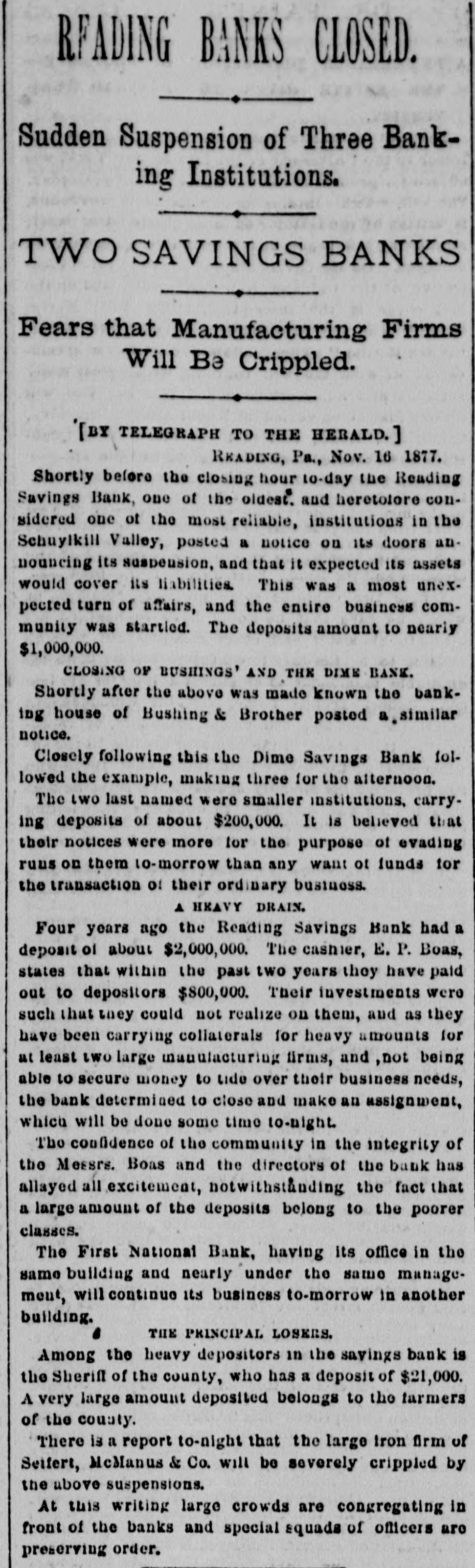 RFADING BANKS CLOSED. Sudden Suspension of Three Banking Institutions. TWO SAVINGS BANKS Fears that Manufacturing Firms Will Be Crippled. [BY TELEGRAPH TO THE HERALD. ] READING, Pa., Nov. 16 1877. Shortly before the closing hour 10-day the Reading Savings Bank, one of the oldest. and heretolore considered one of the most reliable, institutions in the Schuylkill Valley, posted a notice on its doors an. nouncing its suspension, and that it expected its assets would cover its liabilities. This was a most unexpected turn of affairs, and the entire business community was startied. The deposits amount to nearly $1,000,000. CLOSING OF BUSHINGS' AND THE DIME BANK. Shortly after the above was made known the banking house of Bushing & Brother posted a. similar notice. Closely following this the Dime Savings Bank followed the example, making three for the alternoon. The two last named were smaller institutions, carrying deposits of about $200,000. It is believed that their notices were more for the purpose of evading ruus on them 10-morrow than any want of funds for the transaction of their ordinary business. A HEAVY DRAIN. Four years ago the Reading Savings Bank had a deposit of about $2,000,000. The cashier, E. P. Boas, states that within the past two years they have paid out to depositors $800,000. Their investments were such that they could not realize on them, and as they have been carrying collaterals for heavy amounts for at least two large manufacturing firms, and not being able to secure money to tide over their business needs, the bank determined to close and make an assignment, which will be done some time to-night. The confidence of the community in the integrity of the Measrs. Boas and the directors of the bank has allayed all excitement, notwithstanding the fact that a large amount of the deposits belong to the poorer classes. The First National Bank, having its office in the same building and nearly under the same management, will continue its business to-morrow in another building. THE PRINCIPAL LOSERS. Among the heavy depositors in the savings bank is the Sheriff of the county, who has a deposit of $21,000. A very large amount deposited belongs to the farmers of the county. There is a report to-night that the large Iron firm of Setfert, McManus & Co. will be severely crippled by the above suspensions. At this writing large crowds are congregating in front of the banks and special squads of officers are preserving order.